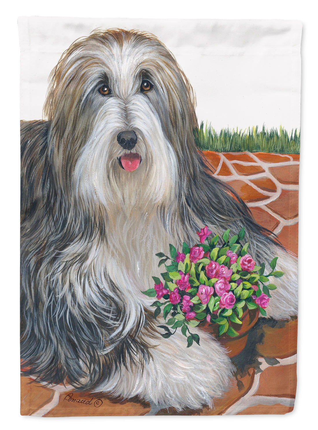 Decorate your space with our Bearded Collie artwork on a Garden Flag. Enhance the beauty of your garden, patio, or yard with Caroline's Treasures Decorative Garden Flag, proudly made in the USA. Crafted from two pieces of thick, double-sided polyester fabric, this 2-ply garden flag is designed to withstand various weather conditions, making it water-resistant and weatherproof. Featuring correctly readable words on both sides, this garden flag offers a delightful visual experience from any angle. With its heavier weight, it stands out among other garden flags, ensuring stability and durability even in wind, rain, and snow. Measuring approximately 11 1/4 inches by 15 1/2 inches, this flag allows you to personalize your outdoor decor. It comes with a 1 1/2-inch sleeve sewn in, allowing easy attachment to any standard garden flag stand or garden size porch hanger (sold separately). Make a statement in your outdoor space with Caroline's Treasures Decorative Garden Flag, a vibrant and high-quality flag that adds color and personality to your surroundings. Proudly made in the USA, it's a symbol of quality craftsmanship and attention to detail.