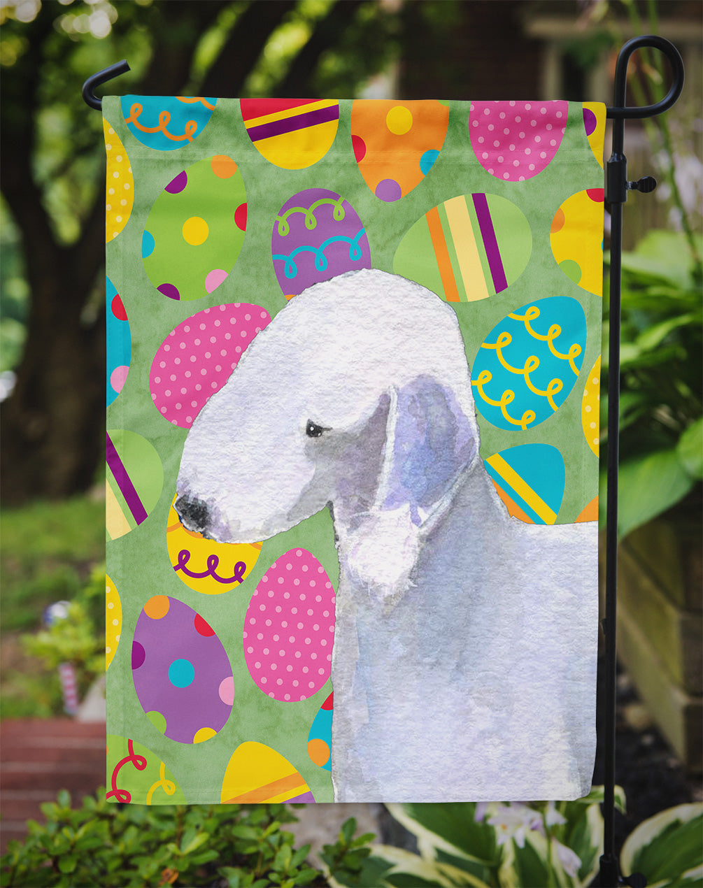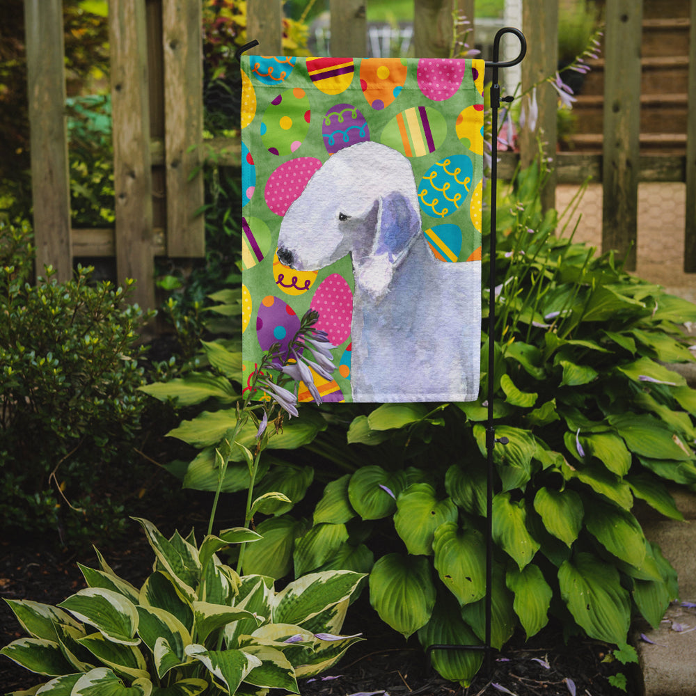 Decorate your space with our Easter Bedlington Terrier artwork on a Garden Flag. Enhance the beauty of your garden, patio, or yard with Caroline's Treasures Decorative Garden Flag, proudly made in the USA. Crafted from two pieces of thick, double-sided polyester fabric, this 2-ply garden flag is designed to withstand various weather conditions, making it water-resistant and weatherproof. Featuring correctly readable words on both sides, this garden flag offers a delightful visual experience from any angle. With its heavier weight, it stands out among other garden flags, ensuring stability and durability even in wind, rain, and snow. Measuring approximately 11 1/4 inches by 15 1/2 inches, this flag allows you to personalize your outdoor decor. It comes with a 1 1/2-inch sleeve sewn in, allowing easy attachment to any standard garden flag stand or garden size porch hanger (sold separately). Make a statement in your outdoor space with Caroline's Treasures Decorative Garden Flag, a vibrant and high-quality flag that adds color and personality to your surroundings. Proudly made in the USA, it's a symbol of quality craftsmanship and attention to detail.