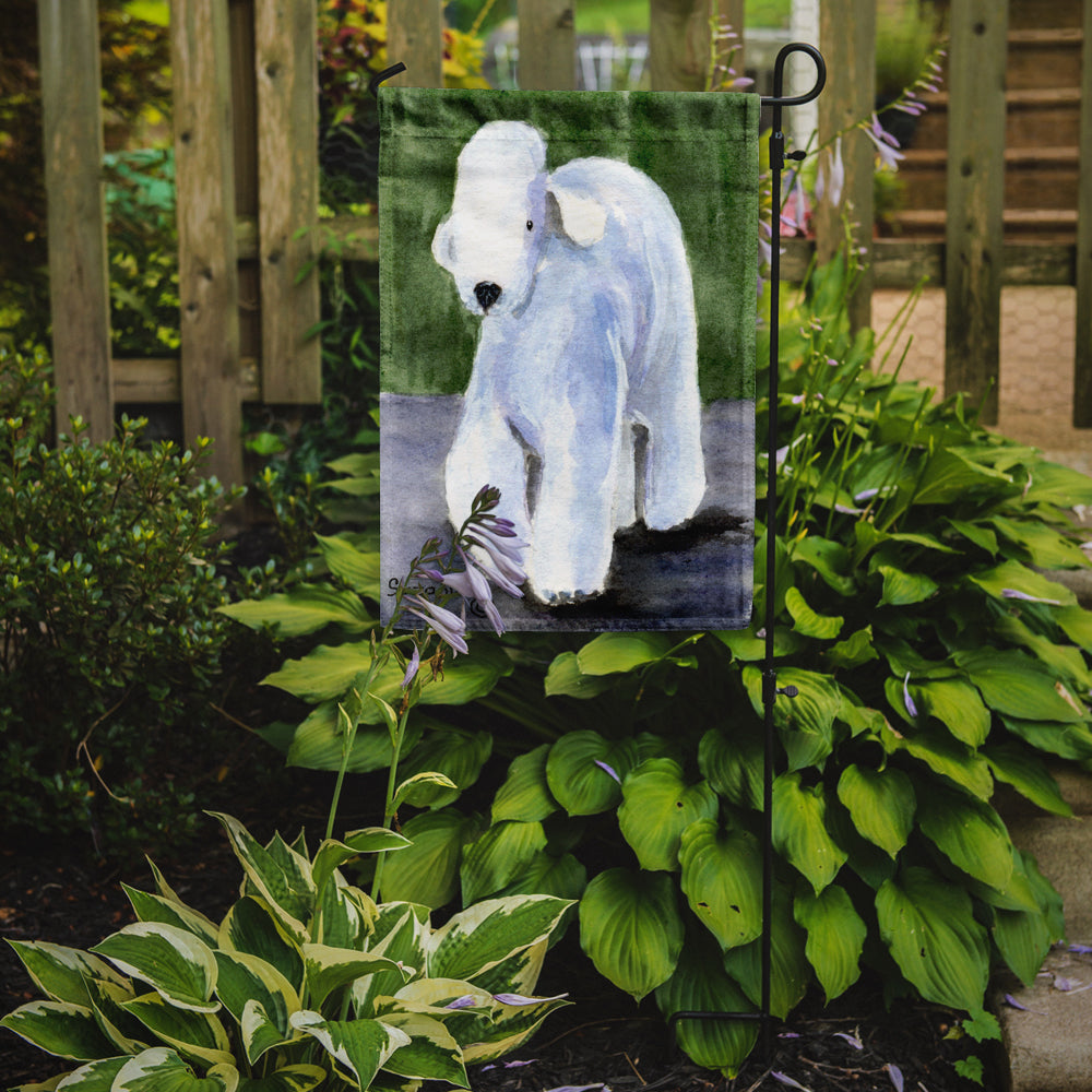 Decorate your space with our Bedlington Terrier artwork on a Garden Flag. Enhance the beauty of your garden, patio, or yard with Caroline's Treasures Decorative Garden Flag, proudly made in the USA. Crafted from two pieces of thick, double-sided polyester fabric, this 2-ply garden flag is designed to withstand various weather conditions, making it water-resistant and weatherproof. Featuring correctly readable words on both sides, this garden flag offers a delightful visual experience from any angle. With its heavier weight, it stands out among other garden flags, ensuring stability and durability even in wind, rain, and snow. Measuring approximately 11 1/4 inches by 15 1/2 inches, this flag allows you to personalize your outdoor decor. It comes with a 1 1/2-inch sleeve sewn in, allowing easy attachment to any standard garden flag stand or garden size porch hanger (sold separately). Make a statement in your outdoor space with Caroline's Treasures Decorative Garden Flag, a vibrant and high-quality flag that adds color and personality to your surroundings. Proudly made in the USA, it's a symbol of quality craftsmanship and attention to detail.