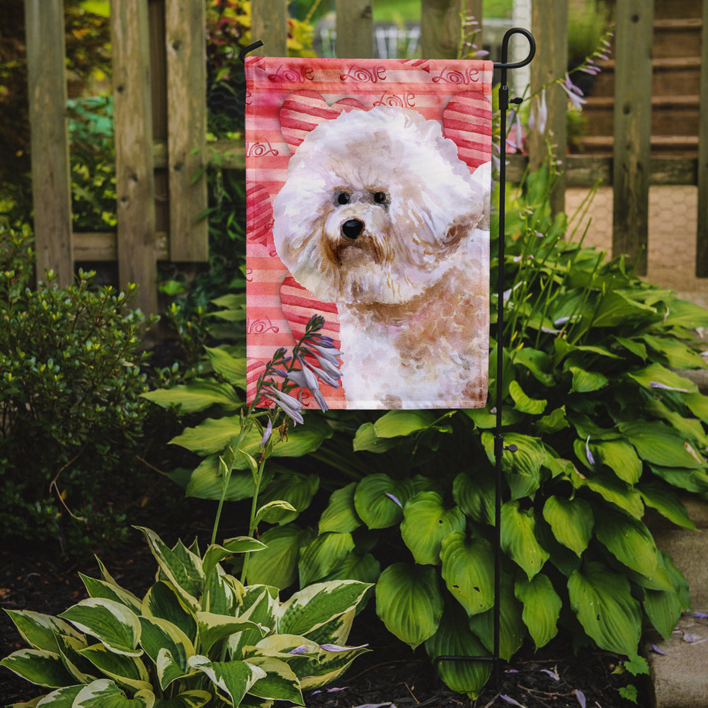Decorate your space with our Valentine's Day Bichon Frise artwork on a Garden Flag. Enhance the beauty of your garden, patio, or yard with Caroline's Treasures Decorative Garden Flag, proudly made in the USA. Crafted from two pieces of thick, double-sided polyester fabric, this 2-ply garden flag is designed to withstand various weather conditions, making it water-resistant and weatherproof. Featuring correctly readable words on both sides, this garden flag offers a delightful visual experience from any angle. With its heavier weight, it stands out among other garden flags, ensuring stability and durability even in wind, rain, and snow. Measuring approximately 11 1/4 inches by 15 1/2 inches, this flag allows you to personalize your outdoor decor. It comes with a 1 1/2-inch sleeve sewn in, allowing easy attachment to any standard garden flag stand or garden size porch hanger (sold separately). Make a statement in your outdoor space with Caroline's Treasures Decorative Garden Flag, a vibrant and high-quality flag that adds color and personality to your surroundings. Proudly made in the USA, it's a symbol of quality craftsmanship and attention to detail.