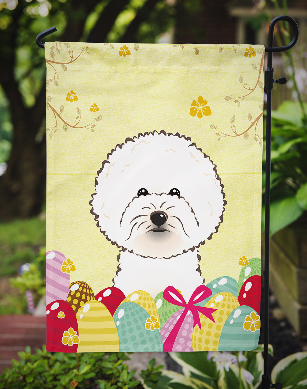 Decorate your space with our Easter Bichon Frise artwork on a Garden Flag. Enhance the beauty of your garden, patio, or yard with Caroline's Treasures Decorative Garden Flag, proudly made in the USA. Crafted from two pieces of thick, double-sided polyester fabric, this 2-ply garden flag is designed to withstand various weather conditions, making it water-resistant and weatherproof. Featuring correctly readable words on both sides, this garden flag offers a delightful visual experience from any angle. With its heavier weight, it stands out among other garden flags, ensuring stability and durability even in wind, rain, and snow. Measuring approximately 11 1/4 inches by 15 1/2 inches, this flag allows you to personalize your outdoor decor. It comes with a 1 1/2-inch sleeve sewn in, allowing easy attachment to any standard garden flag stand or garden size porch hanger (sold separately). Make a statement in your outdoor space with Caroline's Treasures Decorative Garden Flag, a vibrant and high-quality flag that adds color and personality to your surroundings. Proudly made in the USA, it's a symbol of quality craftsmanship and attention to detail.