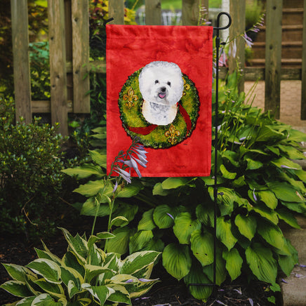 Decorate your space with our Christmas Bichon Frise artwork on a Garden Flag. Enhance the beauty of your garden, patio, or yard with Caroline's Treasures Decorative Garden Flag, proudly made in the USA. Crafted from two pieces of thick, double-sided polyester fabric, this 2-ply garden flag is designed to withstand various weather conditions, making it water-resistant and weatherproof. Featuring correctly readable words on both sides, this garden flag offers a delightful visual experience from any angle. With its heavier weight, it stands out among other garden flags, ensuring stability and durability even in wind, rain, and snow. Measuring approximately 11 1/4 inches by 15 1/2 inches, this flag allows you to personalize your outdoor decor. It comes with a 1 1/2-inch sleeve sewn in, allowing easy attachment to any standard garden flag stand or garden size porch hanger (sold separately). Make a statement in your outdoor space with Caroline's Treasures Decorative Garden Flag, a vibrant and high-quality flag that adds color and personality to your surroundings. Proudly made in the USA, it's a symbol of quality craftsmanship and attention to detail.