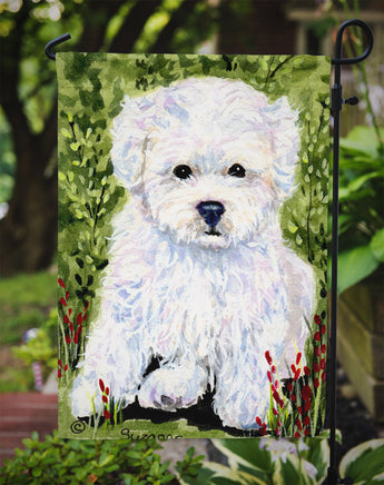 Decorate your space with our Bichon Frise artwork on a Garden Flag. Enhance the beauty of your garden, patio, or yard with Caroline's Treasures Decorative Garden Flag, proudly made in the USA. Crafted from two pieces of thick, double-sided polyester fabric, this 2-ply garden flag is designed to withstand various weather conditions, making it water-resistant and weatherproof. Featuring correctly readable words on both sides, this garden flag offers a delightful visual experience from any angle. With its heavier weight, it stands out among other garden flags, ensuring stability and durability even in wind, rain, and snow. Measuring approximately 11 1/4 inches by 15 1/2 inches, this flag allows you to personalize your outdoor decor. It comes with a 1 1/2-inch sleeve sewn in, allowing easy attachment to any standard garden flag stand or garden size porch hanger (sold separately). Make a statement in your outdoor space with Caroline's Treasures Decorative Garden Flag, a vibrant and high-quality flag that adds color and personality to your surroundings. Proudly made in the USA, it's a symbol of quality craftsmanship and attention to detail.