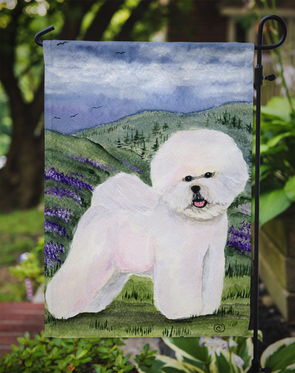 Decorate your space with our Bichon Frise artwork on a Garden Flag. Enhance the beauty of your garden, patio, or yard with Caroline's Treasures Decorative Garden Flag, proudly made in the USA. Crafted from two pieces of thick, double-sided polyester fabric, this 2-ply garden flag is designed to withstand various weather conditions, making it water-resistant and weatherproof. Featuring correctly readable words on both sides, this garden flag offers a delightful visual experience from any angle. With its heavier weight, it stands out among other garden flags, ensuring stability and durability even in wind, rain, and snow. Measuring approximately 11 1/4 inches by 15 1/2 inches, this flag allows you to personalize your outdoor decor. It comes with a 1 1/2-inch sleeve sewn in, allowing easy attachment to any standard garden flag stand or garden size porch hanger (sold separately). Make a statement in your outdoor space with Caroline's Treasures Decorative Garden Flag, a vibrant and high-quality flag that adds color and personality to your surroundings. Proudly made in the USA, it's a symbol of quality craftsmanship and attention to detail.