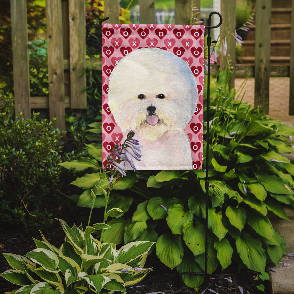 Decorate your space with our Valentine's Day Bichon Frise artwork on a Garden Flag. Enhance the beauty of your garden, patio, or yard with Caroline's Treasures Decorative Garden Flag, proudly made in the USA. Crafted from two pieces of thick, double-sided polyester fabric, this 2-ply garden flag is designed to withstand various weather conditions, making it water-resistant and weatherproof. Featuring correctly readable words on both sides, this garden flag offers a delightful visual experience from any angle. With its heavier weight, it stands out among other garden flags, ensuring stability and durability even in wind, rain, and snow. Measuring approximately 11 1/4 inches by 15 1/2 inches, this flag allows you to personalize your outdoor decor. It comes with a 1 1/2-inch sleeve sewn in, allowing easy attachment to any standard garden flag stand or garden size porch hanger (sold separately). Make a statement in your outdoor space with Caroline's Treasures Decorative Garden Flag, a vibrant and high-quality flag that adds color and personality to your surroundings. Proudly made in the USA, it's a symbol of quality craftsmanship and attention to detail.