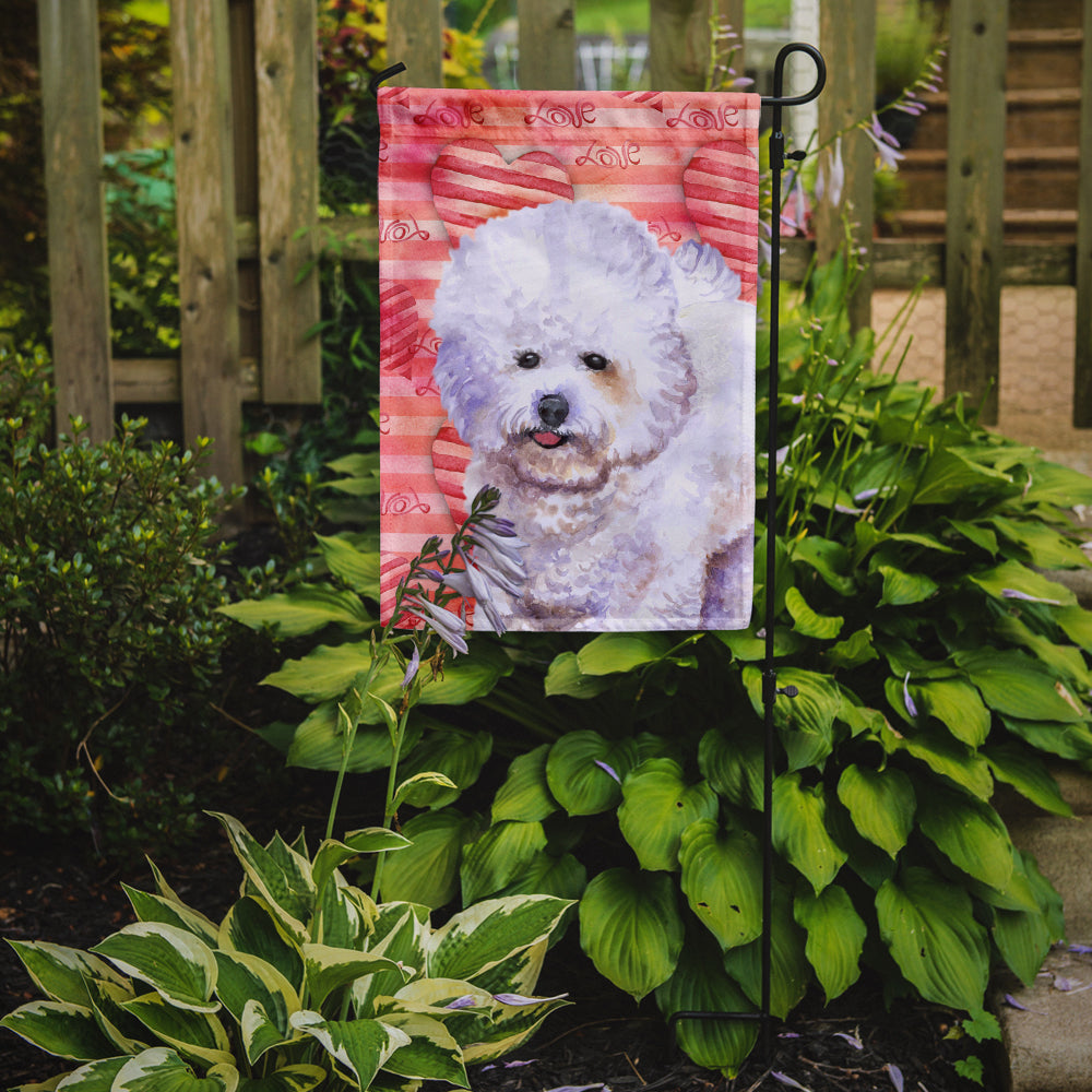 Decorate your space with our Valentine's Day Bichon Frise artwork on a Garden Flag. Enhance the beauty of your garden, patio, or yard with Caroline's Treasures Decorative Garden Flag, proudly made in the USA. Crafted from two pieces of thick, double-sided polyester fabric, this 2-ply garden flag is designed to withstand various weather conditions, making it water-resistant and weatherproof. Featuring correctly readable words on both sides, this garden flag offers a delightful visual experience from any angle. With its heavier weight, it stands out among other garden flags, ensuring stability and durability even in wind, rain, and snow. Measuring approximately 11 1/4 inches by 15 1/2 inches, this flag allows you to personalize your outdoor decor. It comes with a 1 1/2-inch sleeve sewn in, allowing easy attachment to any standard garden flag stand or garden size porch hanger (sold separately). Make a statement in your outdoor space with Caroline's Treasures Decorative Garden Flag, a vibrant and high-quality flag that adds color and personality to your surroundings. Proudly made in the USA, it's a symbol of quality craftsmanship and attention to detail.