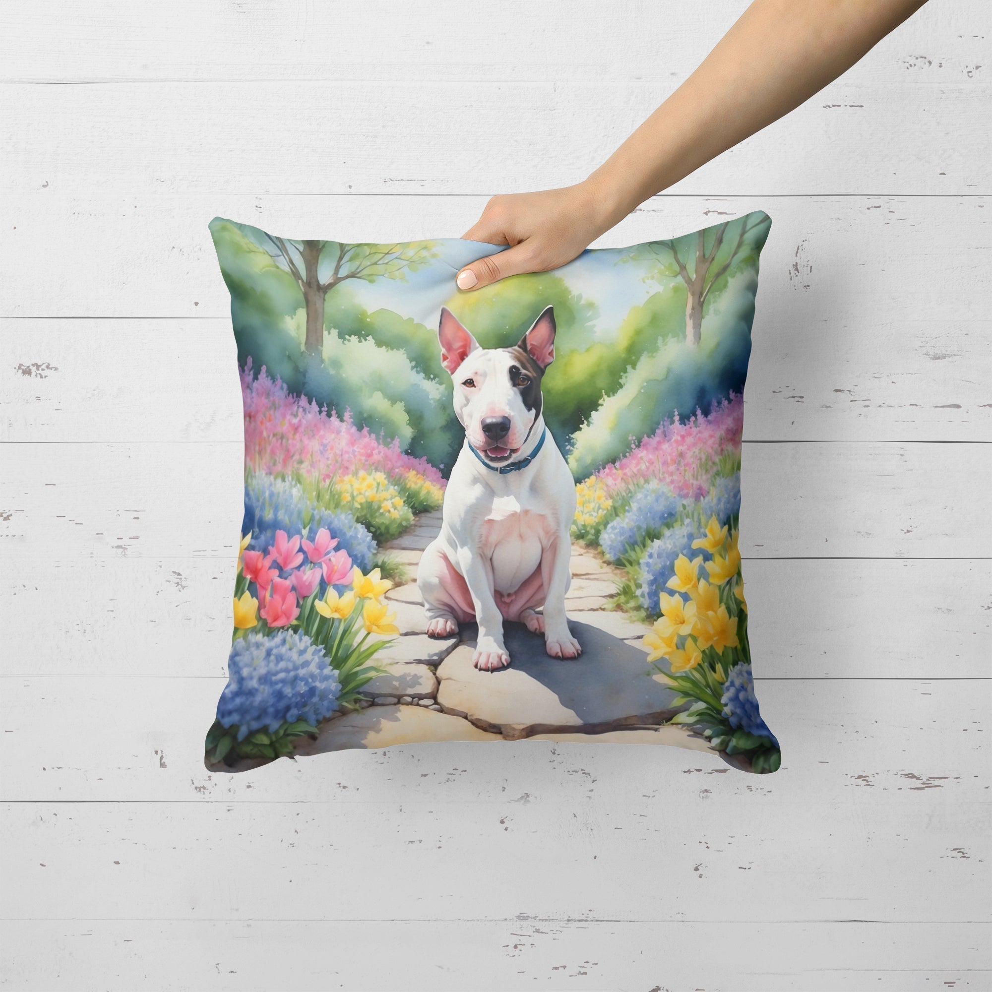 Decorate your space with Caroline's Treasures English Bull Terrier artwork on a Pillow. Bring a bit of Spring into your home with a Spring Pillow. Revitalize your outdoor or indoor living space with Caroline's Treasures 18x18 Fabric Decorative Pillow. With a generously sized dimension of approximately 18 inches by 18 inches, this pillow makes a comfortable and aesthetic addition to any seating area. Made from a unique, water-resistant material developed by Caroline's Treasures, the pillow sham is 100% polyester fabric that's durable and ready to weather any condition. Its vibrant, full-color artwork will not fade over time as it is dyed with color-fast dyes. Whether you place it on your patio furniture, porch, veranda, or indoor couch, its soft canvas fabric ensures a cozy experience. The pillow is handcrafted in the United States, featuring a sham created from three pieces of fabric and a polyester insert for enduring shape and overstuffed comfort. Despite being robustly built to endure the outdoors, it is as soft and snug as your favorite indoor cushions. Please note, as all Caroline's Treasures pillows are handmade, sizes may vary slightly, adding to the charm of this unique decorative item.