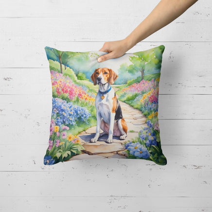 Decorate your space with Caroline's Treasures English Foxhound artwork on a Pillow. Bring a bit of Spring into your home with a Spring Pillow. Revitalize your outdoor or indoor living space with Caroline's Treasures 18x18 Fabric Decorative Pillow. With a generously sized dimension of approximately 18 inches by 18 inches, this pillow makes a comfortable and aesthetic addition to any seating area. Made from a unique, water-resistant material developed by Caroline's Treasures, the pillow sham is 100% polyester fabric that's durable and ready to weather any condition. Its vibrant, full-color artwork will not fade over time as it is dyed with color-fast dyes. Whether you place it on your patio furniture, porch, veranda, or indoor couch, its soft canvas fabric ensures a cozy experience. The pillow is handcrafted in the United States, featuring a sham created from three pieces of fabric and a polyester insert for enduring shape and overstuffed comfort. Despite being robustly built to endure the outdoors, it is as soft and snug as your favorite indoor cushions. Please note, as all Caroline's Treasures pillows are handmade, sizes may vary slightly, adding to the charm of this unique decorative item.