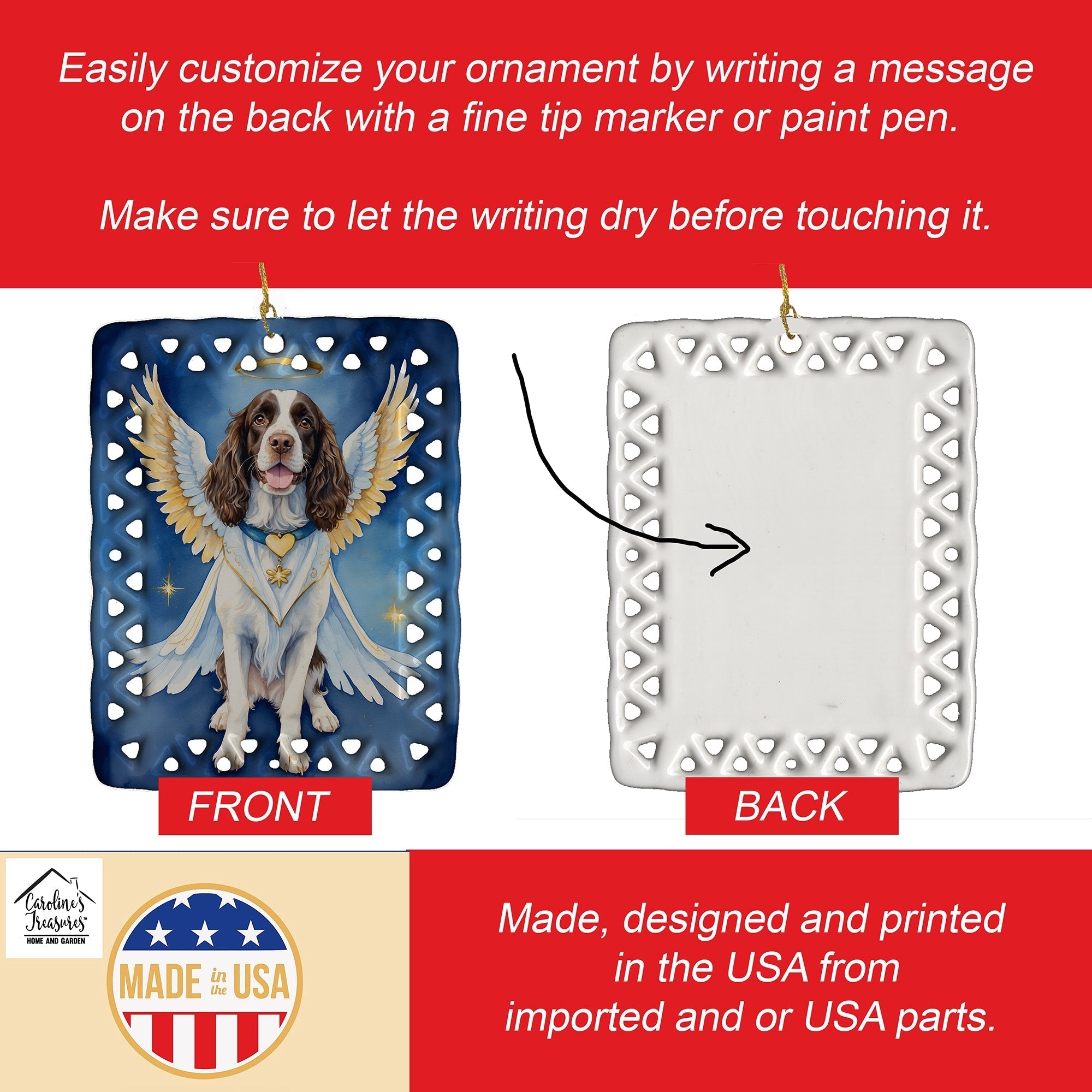 Porcelain Ornament featuring breed specific English Springer Spaniel artwork. Celebrate Christmas with this Christmas Ornament. Add a unique, personal touch to your holiday decor with Caroline's Treasures Rectangular Lattice Porcelain Ornament. Perfect for creating cherished memories, this high-quality ornament shines under festive lights, reflecting warmth and joy throughout your Christmas tree. Crafted with a glossy finish, it showcases vibrant, full-color artwork contributed by Caroline's Treasures talented artists, ensuring your tree is adorned with a burst of color and holiday spirit. What sets this Porcelain Ornament apart is its customizable white back. Use a paint pen or permanent marker to write a heartfelt message, commemorate a special year, or mark an unforgettable date, turning this ornament into a keepsake that will be treasured for years to come. For best results, allow any personalization to dry thoroughly before handling. Each ornament comes complete with a delicate gold cord, making it easy to hang and display. Proudly made in the USA, this ornament measures 3.375 x 2.625 inches and is a thoughtful gift for pet sitters, teachers, family members, or anyone who would appreciate a little extra holiday magic. Bring style, charm, and a touch of personal meaning to your Christmas tree with this beautifully designed ornament..