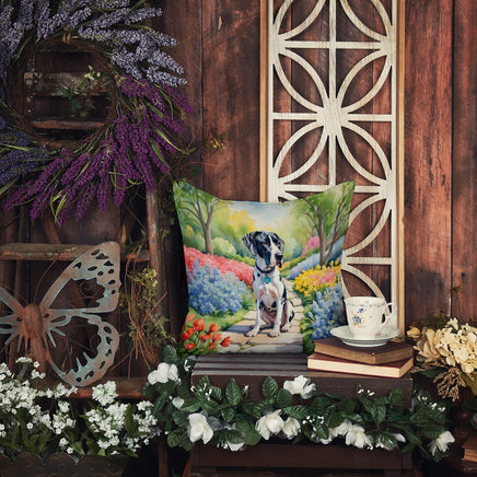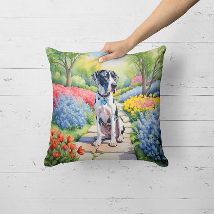 Decorate your space with Caroline's Treasures Great Dane artwork on a Pillow. Bring a bit of Spring into your home with a Spring Pillow. Revitalize your outdoor or indoor living space with Caroline's Treasures 18x18 Fabric Decorative Pillow. With a generously sized dimension of approximately 18 inches by 18 inches, this pillow makes a comfortable and aesthetic addition to any seating area. Made from a unique, water-resistant material developed by Caroline's Treasures, the pillow sham is 100% polyester fabric that's durable and ready to weather any condition. Its vibrant, full-color artwork will not fade over time as it is dyed with color-fast dyes. Whether you place it on your patio furniture, porch, veranda, or indoor couch, its soft canvas fabric ensures a cozy experience. The pillow is handcrafted in the United States, featuring a sham created from three pieces of fabric and a polyester insert for enduring shape and overstuffed comfort. Despite being robustly built to endure the outdoors, it is as soft and snug as your favorite indoor cushions. Please note, as all Caroline's Treasures pillows are handmade, sizes may vary slightly, adding to the charm of this unique decorative item.
