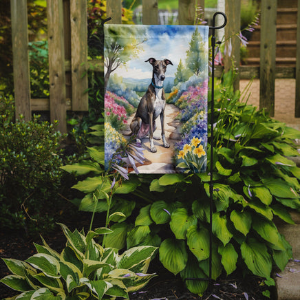 Decorate your space with Caroline's Treasures Greyhound artwork on a Garden Flag. Bring a bit of Spring into your home with a Spring Garden Flag. Enhance the beauty of your garden, patio, or yard with Caroline's Treasures Decorative Garden Flag, proudly made in the USA. Crafted from two pieces of thick, double-sided polyester fabric, this 2-ply garden flag is designed to withstand various weather conditions, making it water-resistant and weatherproof. Featuring correctly readable words on both sides, this garden flag offers a delightful visual experience from any angle. With its heavier weight, it stands out among other garden flags, ensuring stability and durability even in wind, rain, and snow. Measuring approximately 11 1/4 inches by 15 1/2 inches, this flag allows you to personalize your outdoor decor. It comes with a 1 1/2-inch sleeve sewn in, allowing easy attachment to any standard garden flag stand or garden size porch hanger (sold separately). Make a statement in your outdoor space with Caroline's Treasures Decorative Garden Flag, a vibrant and high-quality flag that adds color and personality to your surroundings. Proudly made in the USA, it's a symbol of quality craftsmanship and attention to detail.