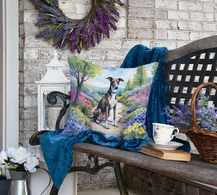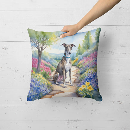 Decorate your space with Caroline's Treasures Greyhound artwork on a Pillow. Bring a bit of Spring into your home with a Spring Pillow. Revitalize your outdoor or indoor living space with Caroline's Treasures 18x18 Fabric Decorative Pillow. With a generously sized dimension of approximately 18 inches by 18 inches, this pillow makes a comfortable and aesthetic addition to any seating area. Made from a unique, water-resistant material developed by Caroline's Treasures, the pillow sham is 100% polyester fabric that's durable and ready to weather any condition. Its vibrant, full-color artwork will not fade over time as it is dyed with color-fast dyes. Whether you place it on your patio furniture, porch, veranda, or indoor couch, its soft canvas fabric ensures a cozy experience. The pillow is handcrafted in the United States, featuring a sham created from three pieces of fabric and a polyester insert for enduring shape and overstuffed comfort. Despite being robustly built to endure the outdoors, it is as soft and snug as your favorite indoor cushions. Please note, as all Caroline's Treasures pillows are handmade, sizes may vary slightly, adding to the charm of this unique decorative item.