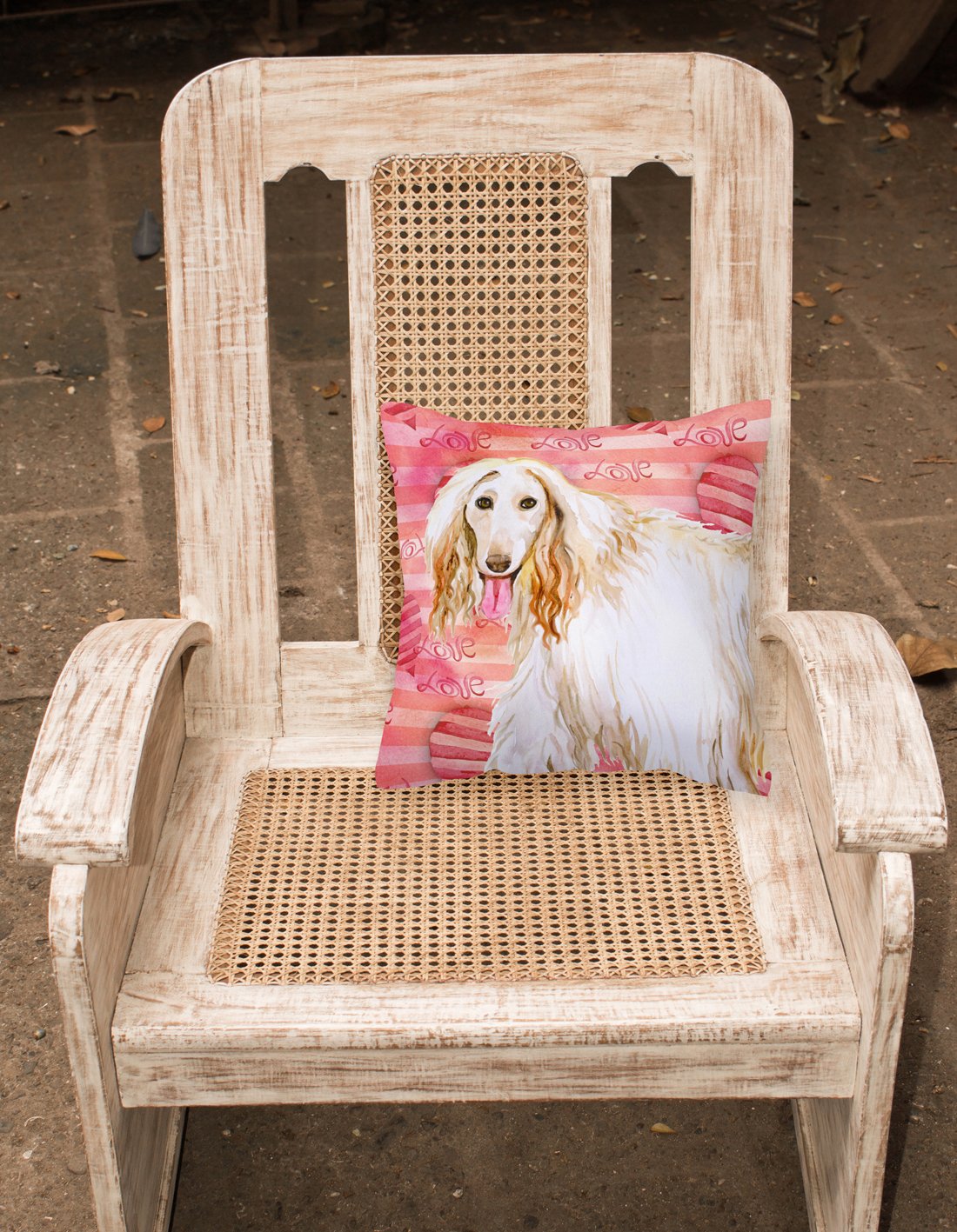 Decorate your space with our Valentine's Day Afghan Hound artwork on a Pillow. Revitalize your outdoor or indoor living space with Caroline's Treasures 18x18 Fabric Decorative Pillow. With a generously sized dimension of approximately 18 inches by 18 inches, this pillow makes a comfortable and aesthetic addition to any seating area. Made from a unique, water-resistant material developed by Caroline's Treasures, the pillow sham is 100% polyester fabric that's durable and ready to weather any condition. Its vibrant, full-color artwork will not fade over time as it is dyed with color-fast dyes. Whether you place it on your patio furniture, porch, veranda, or indoor couch, its soft canvas fabric ensures a cozy experience. The pillow is handcrafted in the United States, featuring a sham created from three pieces of fabric and a polyester insert for enduring shape and overstuffed comfort. Despite being robustly built to endure the outdoors, it is as soft and snug as your favorite indoor cushions. Please note, as all our pillows are handmade, sizes may vary slightly, adding to the charm of this unique decorative item.