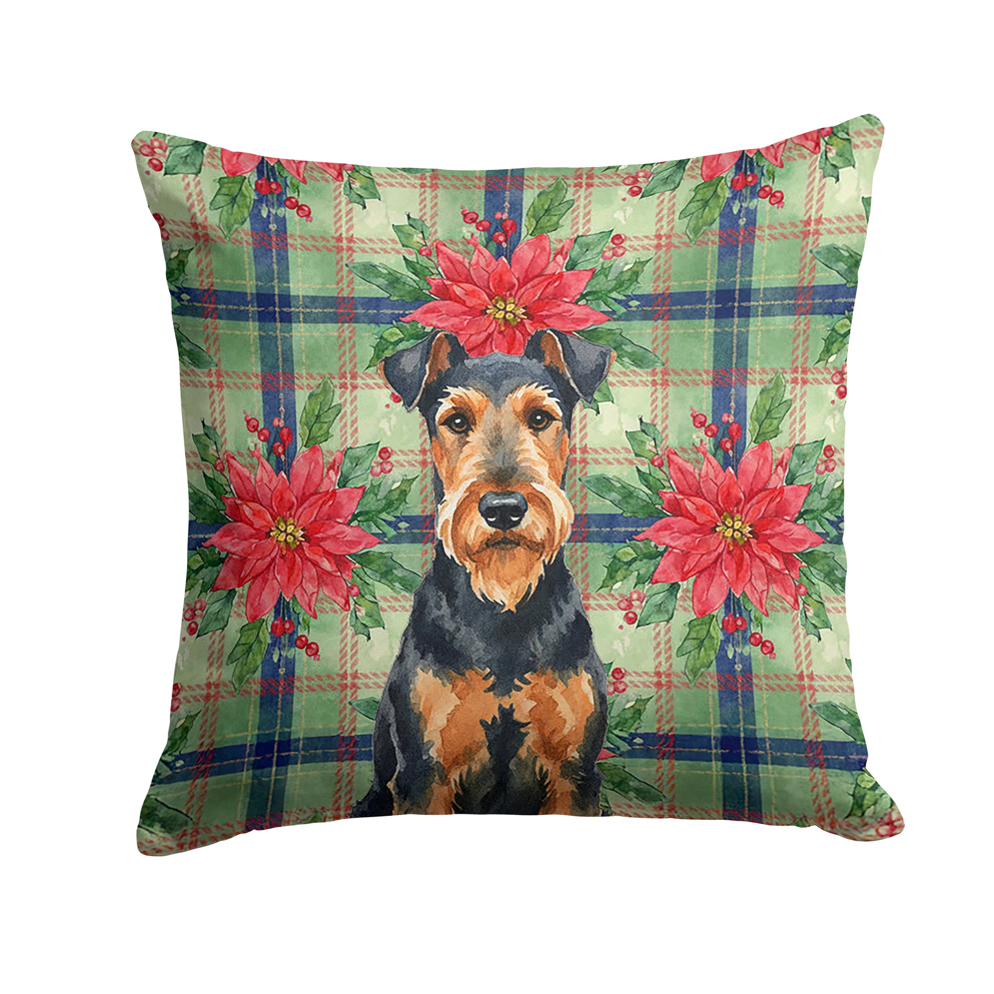 Throw Pillow featuring breed specific Airedale Terrier artwork. Celebrate Christmas with this Christmas Pillow. Add a touch of vibrancy and comfort to your outdoor seating with Caroline's Treasures Fabric Decorative Pillow. Approximately 14 inches by 14 inches, this outdoor pillow is crafted to elevate the appeal of your patio furniture, infusing it with vivid color and artistic flair. The pillow includes a 100% Polyester Fabric sham filled with a quality pillow form to provide superior comfort. Innovatively made from this Caroline's Treasures brand new material, specifically woven for its water resistance, this pillow is designed for durability. The soft canvas fabric offers versatility in use, fit for your indoor couch or your outdoor patio, porch, or veranda. The fabric is dyed with colorfast dyes built for resilience against weather conditions, ensuring the pillow retains its beauty over time. Constructed by sewing three fabric pieces to create a sham, the polyester insert is then nestled inside to form the pillow, resulting in an overstuffed pillow that maintains its shape. Both the sham and the pillow insert are proudly made in the United States. As the pillows are handcrafted, there may be minor variations in size, further enhancing their unique charm. Experience comfort in style with Caroline's Treasures Fabric Decorative Pillow.