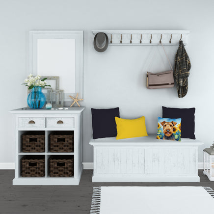 Decorate your space with our Airedale Terrier artwork on a Pillow. Bring a bit of Summer into your home with a Summer Pillow. Add a touch of vibrancy and comfort to your outdoor seating with Caroline's Treasures Fabric Decorative Pillow. Measuring approximately 14 inches by 14 inches, this outdoor pillow is crafted to elevate the appeal of your patio furniture, infusing it with vivid color and artistic flair. The pillow includes a 100% Polyester Fabric sham filled with a quality pillow form to provide superior comfort. Innovatively made from our brand new material, specifically woven for its water resistance, this pillow is designed for durability. The soft canvas fabric offers versatility in use, fit for your indoor couch or your outdoor patio, porch, or veranda. The fabric is dyed with colorfast dyes built for resilience against weather conditions, ensuring the pillow retains its beauty over time. Constructed by sewing three fabric pieces to create a sham, the polyester insert is then nestled inside to form the pillow, resulting in an overstuffed pillow that maintains its shape. Both the sham and the pillow insert are proudly made in the United States. As the pillows are handcrafted, there may be minor variations in size, further enhancing their unique charm. Experience comfort in style with Caroline's Treasures Fabric Decorative Pillow.