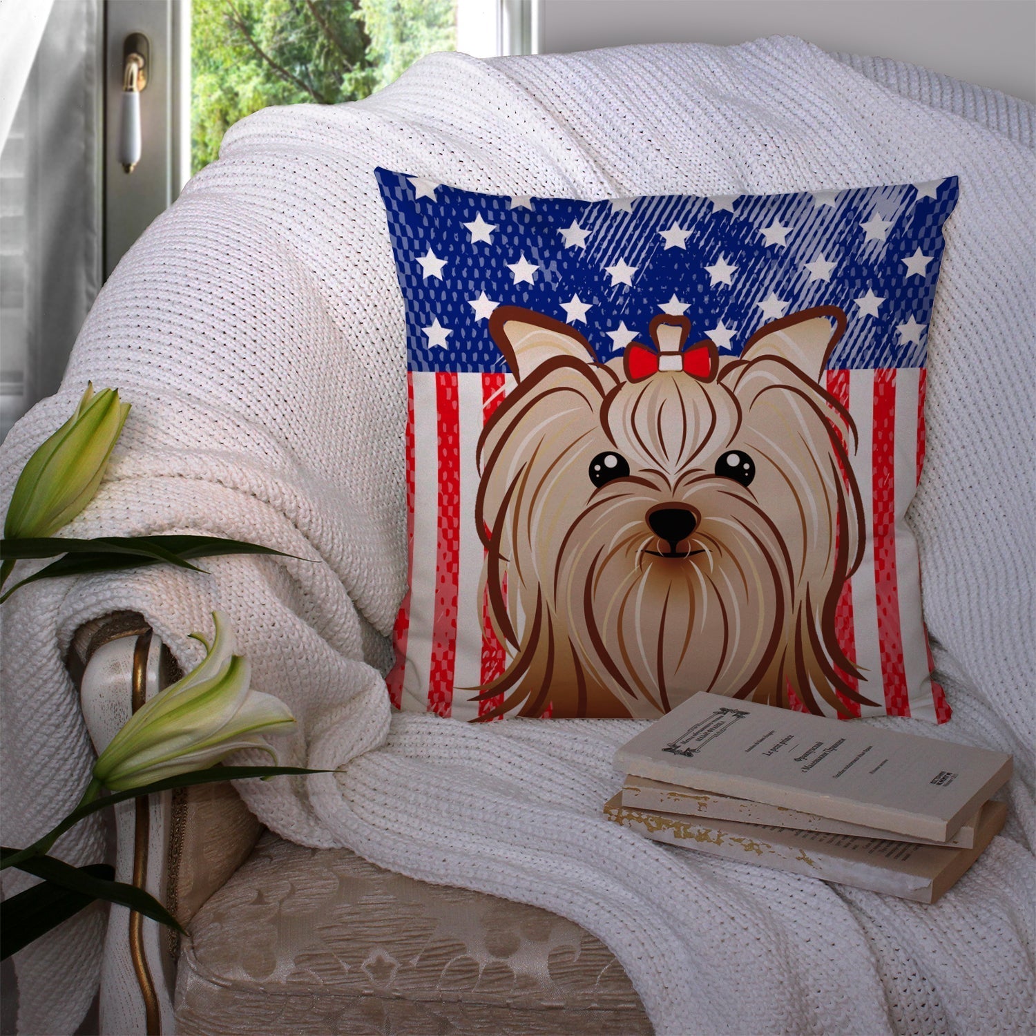 Decorate your space with our Yorkshire Terrier artwork on a Pillow. Add a touch of vibrancy and comfort to your outdoor seating with Caroline's Treasures Fabric Decorative Pillow. Measuring approximately 14 inches by 14 inches, this outdoor pillow is crafted to elevate the appeal of your patio furniture, infusing it with vivid color and artistic flair. The pillow includes a 100% Polyester Fabric sham filled with a quality pillow form to provide superior comfort. Innovatively made from our brand new material, specifically woven for its water resistance, this pillow is designed for durability. The soft canvas fabric offers versatility in use, fit for your indoor couch or your outdoor patio, porch, or veranda. The fabric is dyed with colorfast dyes built for resilience against weather conditions, ensuring the pillow retains its beauty over time. Constructed by sewing three fabric pieces to create a sham, the polyester insert is then nestled inside to form the pillow, resulting in an overstuffed pillow that maintains its shape. Both the sham and the pillow insert are proudly made in the United States. As the pillows are handcrafted, there may be minor variations in size, further enhancing their unique charm. Experience comfort in style with Caroline's Treasures Fabric Decorative Pillow.