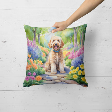 Decorate your space with Caroline's Treasures Goldendoodle artwork on a Pillow. Bring a bit of Spring into your home with a Spring Pillow. Revitalize your outdoor or indoor living space with Caroline's Treasures 18x18 Fabric Decorative Pillow. With a generously sized dimension of approximately 18 inches by 18 inches, this pillow makes a comfortable and aesthetic addition to any seating area. Made from a unique, water-resistant material developed by Caroline's Treasures, the pillow sham is 100% polyester fabric that's durable and ready to weather any condition. Its vibrant, full-color artwork will not fade over time as it is dyed with color-fast dyes. Whether you place it on your patio furniture, porch, veranda, or indoor couch, its soft canvas fabric ensures a cozy experience. The pillow is handcrafted in the United States, featuring a sham created from three pieces of fabric and a polyester insert for enduring shape and overstuffed comfort. Despite being robustly built to endure the outdoors, it is as soft and snug as your favorite indoor cushions. Please note, as all Caroline's Treasures pillows are handmade, sizes may vary slightly, adding to the charm of this unique decorative item.