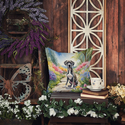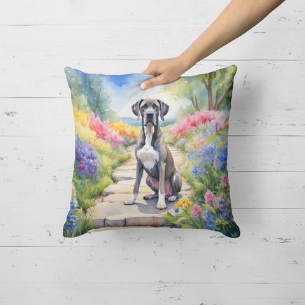Decorate your space with Caroline's Treasures Great Dane artwork on a Pillow. Bring a bit of Spring into your home with a Spring Pillow. Revitalize your outdoor or indoor living space with Caroline's Treasures 18x18 Fabric Decorative Pillow. With a generously sized dimension of approximately 18 inches by 18 inches, this pillow makes a comfortable and aesthetic addition to any seating area. Made from a unique, water-resistant material developed by Caroline's Treasures, the pillow sham is 100% polyester fabric that's durable and ready to weather any condition. Its vibrant, full-color artwork will not fade over time as it is dyed with color-fast dyes. Whether you place it on your patio furniture, porch, veranda, or indoor couch, its soft canvas fabric ensures a cozy experience. The pillow is handcrafted in the United States, featuring a sham created from three pieces of fabric and a polyester insert for enduring shape and overstuffed comfort. Despite being robustly built to endure the outdoors, it is as soft and snug as your favorite indoor cushions. Please note, as all Caroline's Treasures pillows are handmade, sizes may vary slightly, adding to the charm of this unique decorative item.
