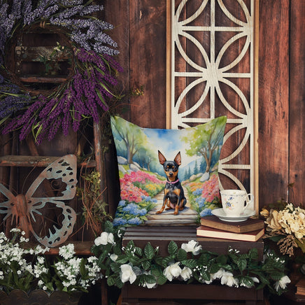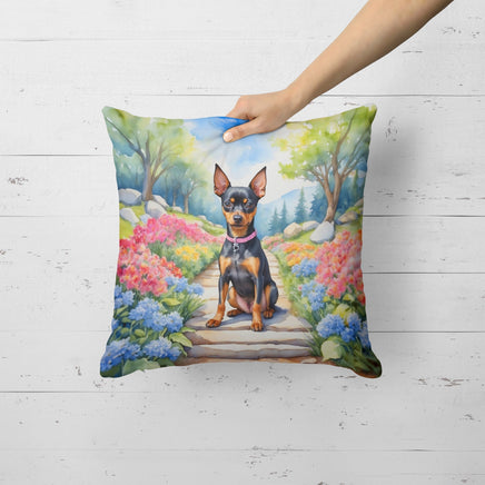 Decorate your space with Caroline's Treasures Miniature Pinscher artwork on a Pillow. Bring a bit of Spring into your home with a Spring Pillow. Revitalize your outdoor or indoor living space with Caroline's Treasures 18x18 Fabric Decorative Pillow. With a generously sized dimension of approximately 18 inches by 18 inches, this pillow makes a comfortable and aesthetic addition to any seating area. Made from a unique, water-resistant material developed by Caroline's Treasures, the pillow sham is 100% polyester fabric that's durable and ready to weather any condition. Its vibrant, full-color artwork will not fade over time as it is dyed with color-fast dyes. Whether you place it on your patio furniture, porch, veranda, or indoor couch, its soft canvas fabric ensures a cozy experience. The pillow is handcrafted in the United States, featuring a sham created from three pieces of fabric and a polyester insert for enduring shape and overstuffed comfort. Despite being robustly built to endure the outdoors, it is as soft and snug as your favorite indoor cushions. Please note, as all Caroline's Treasures pillows are handmade, sizes may vary slightly, adding to the charm of this unique decorative item.