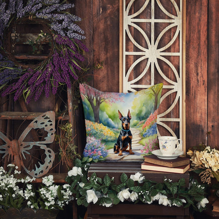 Decorate your space with Caroline's Treasures Doberman Pinscher artwork on a Pillow. Bring a bit of Spring into your home with a Spring Pillow. Revitalize your outdoor or indoor living space with Caroline's Treasures 18x18 Fabric Decorative Pillow. With a generously sized dimension of approximately 18 inches by 18 inches, this pillow makes a comfortable and aesthetic addition to any seating area. Made from a unique, water-resistant material developed by Caroline's Treasures, the pillow sham is 100% polyester fabric that's durable and ready to weather any condition. Its vibrant, full-color artwork will not fade over time as it is dyed with color-fast dyes. Whether you place it on your patio furniture, porch, veranda, or indoor couch, its soft canvas fabric ensures a cozy experience. The pillow is handcrafted in the United States, featuring a sham created from three pieces of fabric and a polyester insert for enduring shape and overstuffed comfort. Despite being robustly built to endure the outdoors, it is as soft and snug as your favorite indoor cushions. Please note, as all Caroline's Treasures pillows are handmade, sizes may vary slightly, adding to the charm of this unique decorative item.