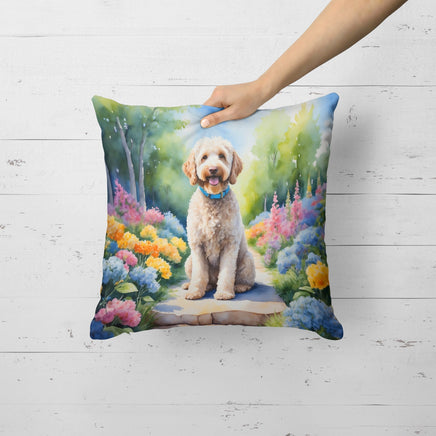 Decorate your space with Caroline's Treasures Labradoodle artwork on a Pillow. Bring a bit of Spring into your home with a Spring Pillow. Revitalize your outdoor or indoor living space with Caroline's Treasures 18x18 Fabric Decorative Pillow. With a generously sized dimension of approximately 18 inches by 18 inches, this pillow makes a comfortable and aesthetic addition to any seating area. Made from a unique, water-resistant material developed by Caroline's Treasures, the pillow sham is 100% polyester fabric that's durable and ready to weather any condition. Its vibrant, full-color artwork will not fade over time as it is dyed with color-fast dyes. Whether you place it on your patio furniture, porch, veranda, or indoor couch, its soft canvas fabric ensures a cozy experience. The pillow is handcrafted in the United States, featuring a sham created from three pieces of fabric and a polyester insert for enduring shape and overstuffed comfort. Despite being robustly built to endure the outdoors, it is as soft and snug as your favorite indoor cushions. Please note, as all Caroline's Treasures pillows are handmade, sizes may vary slightly, adding to the charm of this unique decorative item.