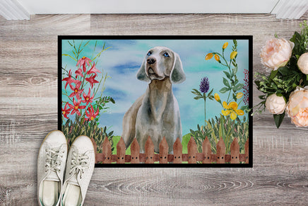 Decorate your space with Caroline's Treasures Weimaraner artwork on a Doormat. Bring a bit of Spring into your home with a Spring Doormat. Welcome your guests in style with Caroline's Treasures Artwork Door Mat, designed to withstand almost any weather condition. This mat, measuring approximately 18 by 27 inches, is held together by durable black binding tape. Its top layer, composed of polyester felt, is dyed with the eye-catching image you see on the mat. A few layers below provide the mat with stability, while its rubber bottom is stamped to help prevent slipping and ensures safety. Caroline's Treasures mat works wonderfully as both an indoor or outdoor door mat. For cleaning, simply hose it off with water or use a power washer - no need for any cleaner that produces suds. Avoid scrubbing with a brush, instead, opt for the vacuum on floor setting. Designed manufactured and printed in the USA, this mat is a perfect addition to your porch, outdoor kitchen, entryway, or any indoor space. Its unique design makes it a charming decorative rug that greets your guests and adds a stylish touch to your home decor.