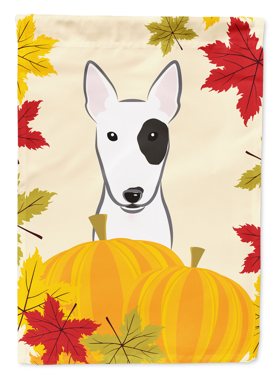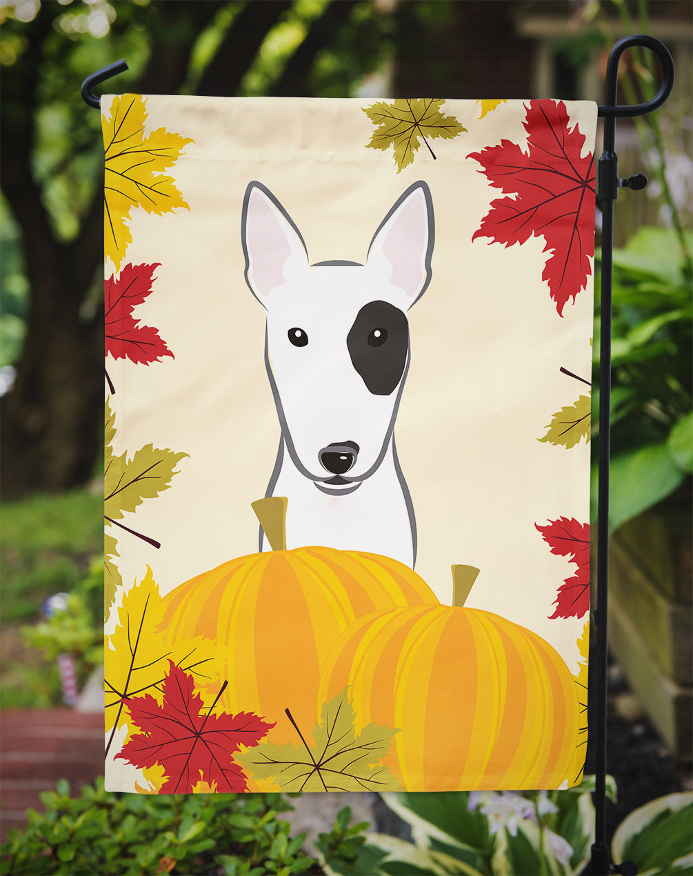 Decorate your space with Caroline's Treasures Thanksgiving Bull Terrier artwork on a Garden Flag. Enhance the beauty of your garden, patio, or yard with Caroline's Treasures Decorative Garden Flag, proudly made in the USA. Crafted from two pieces of thick, double-sided polyester fabric, this 2-ply garden flag is designed to withstand various weather conditions, making it water-resistant and weatherproof. Featuring correctly readable words on both sides, this garden flag offers a delightful visual experience from any angle. With its heavier weight, it stands out among other garden flags, ensuring stability and durability even in wind, rain, and snow. Measuring approximately 11 1/4 inches by 15 1/2 inches, this flag allows you to personalize your outdoor decor. It comes with a 1 1/2-inch sleeve sewn in, allowing easy attachment to any standard garden flag stand or garden size porch hanger (sold separately). Make a statement in your outdoor space with Caroline's Treasures Decorative Garden Flag, a vibrant and high-quality flag that adds color and personality to your surroundings. Proudly made in the USA, it's a symbol of quality craftsmanship and attention to detail.
