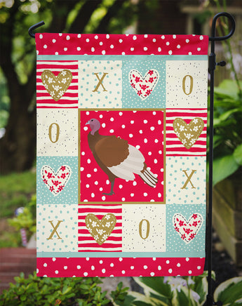 Decorate your space with Caroline's Treasures Valentine's Day Bourbon Red Turkey Hen artwork on a Garden Flag. Enhance the beauty of your garden, patio, or yard with Caroline's Treasures Decorative Garden Flag, proudly made in the USA. Crafted from two pieces of thick, double-sided polyester fabric, this 2-ply garden flag is designed to withstand various weather conditions, making it water-resistant and weatherproof. Featuring correctly readable words on both sides, this garden flag offers a delightful visual experience from any angle. With its heavier weight, it stands out among other garden flags, ensuring stability and durability even in wind, rain, and snow. Measuring approximately 11 1/4 inches by 15 1/2 inches, this flag allows you to personalize your outdoor decor. It comes with a 1 1/2-inch sleeve sewn in, allowing easy attachment to any standard garden flag stand or garden size porch hanger (sold separately). Make a statement in your outdoor space with Caroline's Treasures Decorative Garden Flag, a vibrant and high-quality flag that adds color and personality to your surroundings. Proudly made in the USA, it's a symbol of quality craftsmanship and attention to detail.