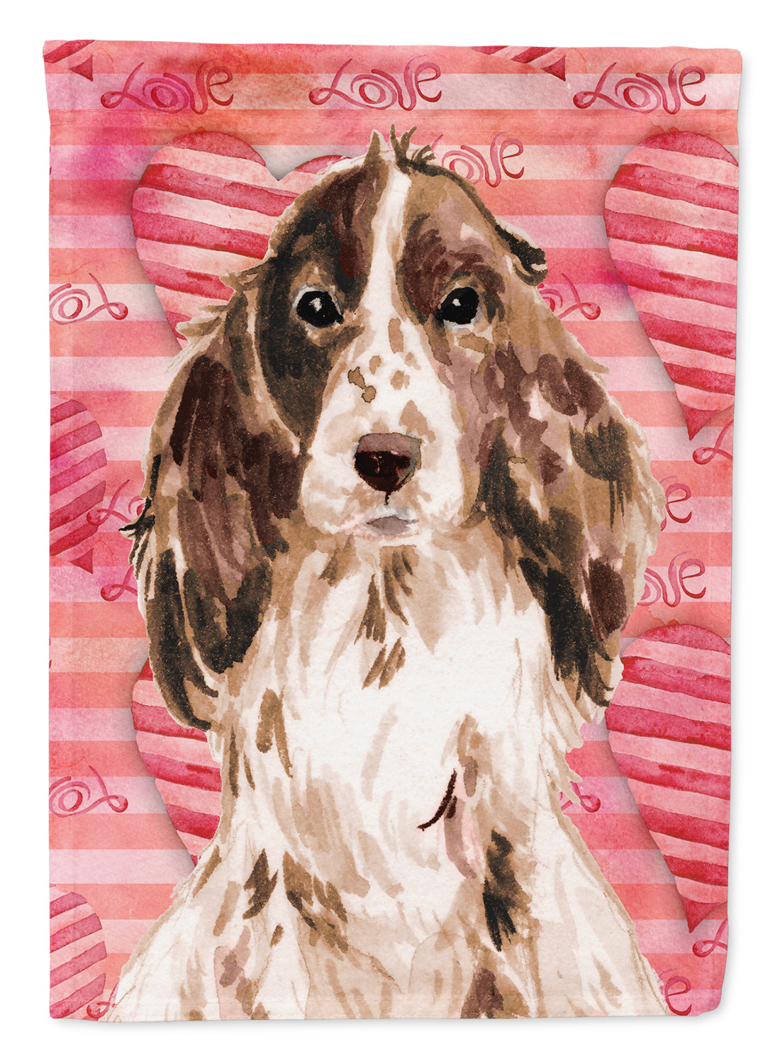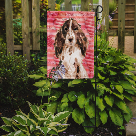 Decorate your space with Caroline's Treasures Valentine's Day Cocker Spaniel artwork on a Garden Flag. Enhance the beauty of your garden, patio, or yard with Caroline's Treasures Decorative Garden Flag, proudly made in the USA. Crafted from two pieces of thick, double-sided polyester fabric, this 2-ply garden flag is designed to withstand various weather conditions, making it water-resistant and weatherproof. Featuring correctly readable words on both sides, this garden flag offers a delightful visual experience from any angle. With its heavier weight, it stands out among other garden flags, ensuring stability and durability even in wind, rain, and snow. Measuring approximately 11 1/4 inches by 15 1/2 inches, this flag allows you to personalize your outdoor decor. It comes with a 1 1/2-inch sleeve sewn in, allowing easy attachment to any standard garden flag stand or garden size porch hanger (sold separately). Make a statement in your outdoor space with Caroline's Treasures Decorative Garden Flag, a vibrant and high-quality flag that adds color and personality to your surroundings. Proudly made in the USA, it's a symbol of quality craftsmanship and attention to detail.