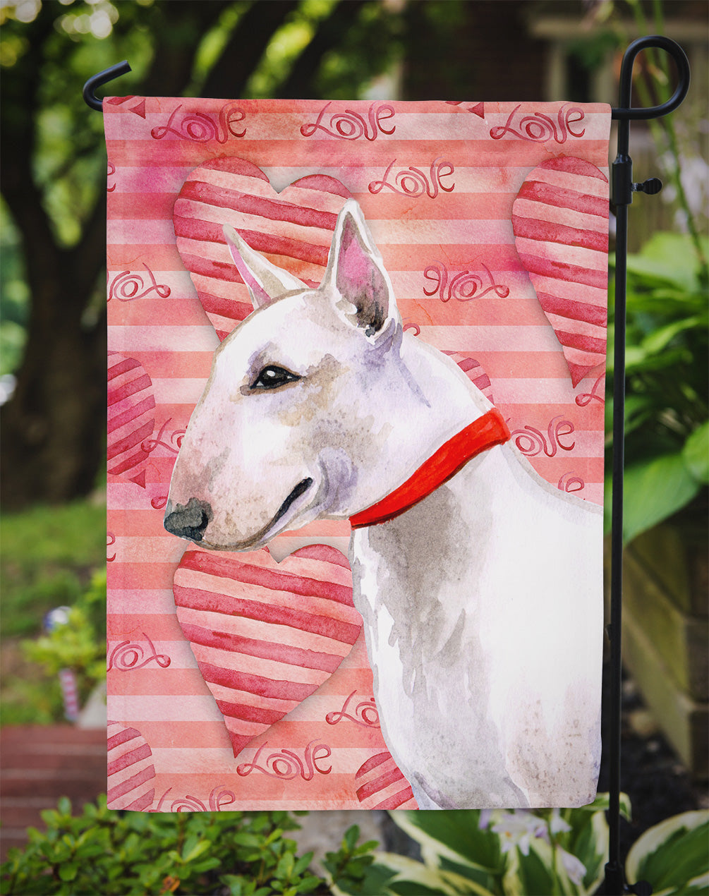 Decorate your space with Caroline's Treasures Valentine's Day Bull Terrier artwork on a Garden Flag. Enhance the beauty of your garden, patio, or yard with Caroline's Treasures Decorative Garden Flag, proudly made in the USA. Crafted from two pieces of thick, double-sided polyester fabric, this 2-ply garden flag is designed to withstand various weather conditions, making it water-resistant and weatherproof. Featuring correctly readable words on both sides, this garden flag offers a delightful visual experience from any angle. With its heavier weight, it stands out among other garden flags, ensuring stability and durability even in wind, rain, and snow. Measuring approximately 11 1/4 inches by 15 1/2 inches, this flag allows you to personalize your outdoor decor. It comes with a 1 1/2-inch sleeve sewn in, allowing easy attachment to any standard garden flag stand or garden size porch hanger (sold separately). Make a statement in your outdoor space with Caroline's Treasures Decorative Garden Flag, a vibrant and high-quality flag that adds color and personality to your surroundings. Proudly made in the USA, it's a symbol of quality craftsmanship and attention to detail.