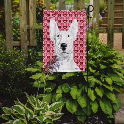 Decorate your space with Caroline's Treasures Valentine's Day Bull Terrier artwork on a Garden Flag. Enhance the beauty of your garden, patio, or yard with Caroline's Treasures Decorative Garden Flag, proudly made in the USA. Crafted from two pieces of thick, double-sided polyester fabric, this 2-ply garden flag is designed to withstand various weather conditions, making it water-resistant and weatherproof. Featuring correctly readable words on both sides, this garden flag offers a delightful visual experience from any angle. With its heavier weight, it stands out among other garden flags, ensuring stability and durability even in wind, rain, and snow. Measuring approximately 11 1/4 inches by 15 1/2 inches, this flag allows you to personalize your outdoor decor. It comes with a 1 1/2-inch sleeve sewn in, allowing easy attachment to any standard garden flag stand or garden size porch hanger (sold separately). Make a statement in your outdoor space with Caroline's Treasures Decorative Garden Flag, a vibrant and high-quality flag that adds color and personality to your surroundings. Proudly made in the USA, it's a symbol of quality craftsmanship and attention to detail.