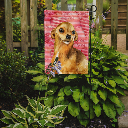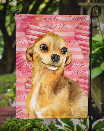 Decorate your space with Caroline's Treasures Valentine's Day Chihuahua artwork on a Garden Flag. Enhance the beauty of your garden, patio, or yard with Caroline's Treasures Decorative Garden Flag, proudly made in the USA. Crafted from two pieces of thick, double-sided polyester fabric, this 2-ply garden flag is designed to withstand various weather conditions, making it water-resistant and weatherproof. Featuring correctly readable words on both sides, this garden flag offers a delightful visual experience from any angle. With its heavier weight, it stands out among other garden flags, ensuring stability and durability even in wind, rain, and snow. Measuring approximately 11 1/4 inches by 15 1/2 inches, this flag allows you to personalize your outdoor decor. It comes with a 1 1/2-inch sleeve sewn in, allowing easy attachment to any standard garden flag stand or garden size porch hanger (sold separately). Make a statement in your outdoor space with Caroline's Treasures Decorative Garden Flag, a vibrant and high-quality flag that adds color and personality to your surroundings. Proudly made in the USA, it's a symbol of quality craftsmanship and attention to detail.