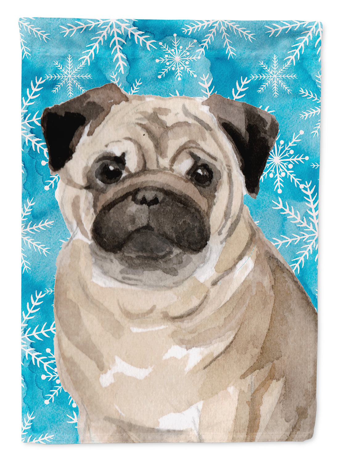 Decorate your space with our Pug artwork on a Garden Flag. Bring a bit of Winter into your home with a Winter Garden Flag. Enhance the beauty of your garden, patio, or yard with Caroline's Treasures Decorative Garden Flag, proudly made in the USA. Crafted from two pieces of thick, double-sided polyester fabric, this 2-ply garden flag is designed to withstand various weather conditions, making it water-resistant and weatherproof. Featuring correctly readable words on both sides, this garden flag offers a delightful visual experience from any angle. With its heavier weight, it stands out among other garden flags, ensuring stability and durability even in wind, rain, and snow. Measuring approximately 11 1/4 inches by 15 1/2 inches, this flag allows you to personalize your outdoor decor. It comes with a 1 1/2-inch sleeve sewn in, allowing easy attachment to any standard garden flag stand or garden size porch hanger (sold separately). Make a statement in your outdoor space with Caroline's Treasures Decorative Garden Flag, a vibrant and high-quality flag that adds color and personality to your surroundings. Proudly made in the USA, it's a symbol of quality craftsmanship and attention to detail.