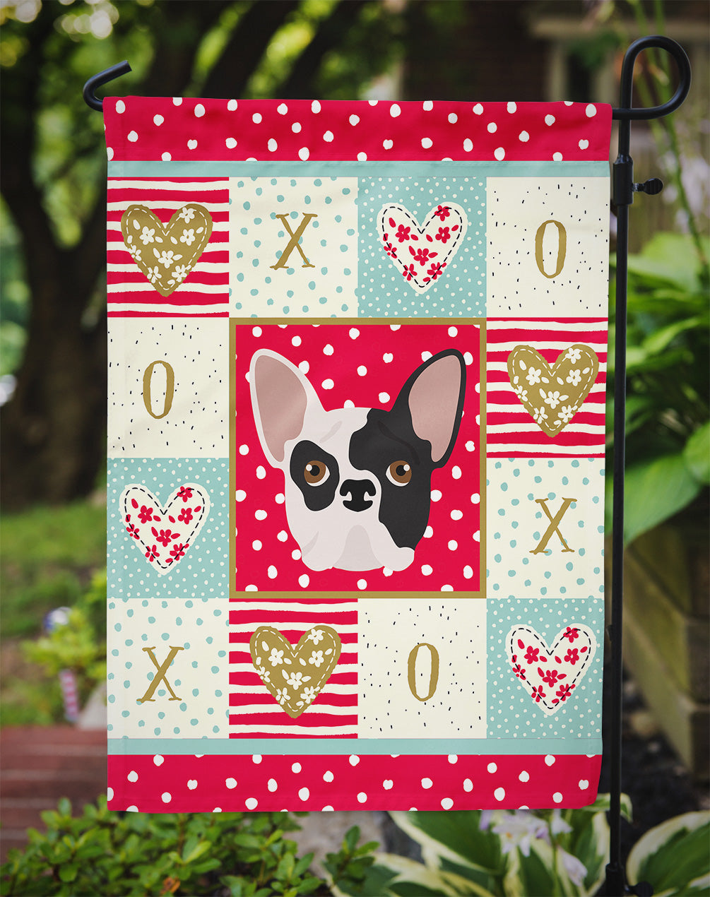 Decorate your space with our Valentine's Day French Bulldog artwork on a Garden Flag. Enhance the beauty of your garden, patio, or yard with Caroline's Treasures Decorative Garden Flag, proudly made in the USA. Crafted from two pieces of thick, double-sided polyester fabric, this 2-ply garden flag is designed to withstand various weather conditions, making it water-resistant and weatherproof. Featuring correctly readable words on both sides, this garden flag offers a delightful visual experience from any angle. With its heavier weight, it stands out among other garden flags, ensuring stability and durability even in wind, rain, and snow. Measuring approximately 11 1/4 inches by 15 1/2 inches, this flag allows you to personalize your outdoor decor. It comes with a 1 1/2-inch sleeve sewn in, allowing easy attachment to any standard garden flag stand or garden size porch hanger (sold separately). Make a statement in your outdoor space with Caroline's Treasures Decorative Garden Flag, a vibrant and high-quality flag that adds color and personality to your surroundings. Proudly made in the USA, it's a symbol of quality craftsmanship and attention to detail.