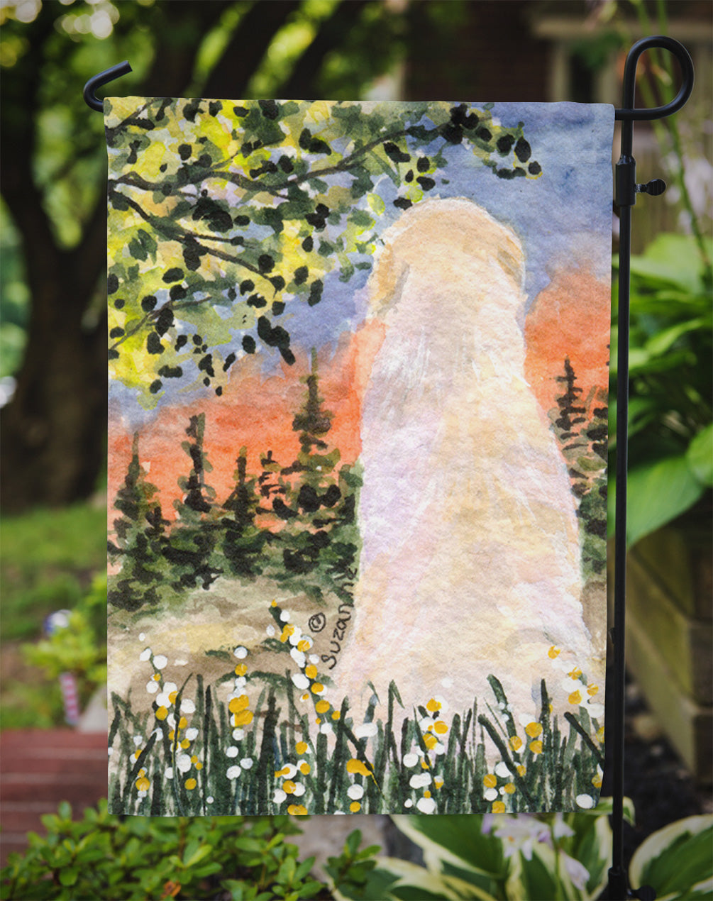 Decorate your space with our Golden Retriever artwork on a Garden Flag. Enhance the beauty of your garden, patio, or yard with Caroline's Treasures Decorative Garden Flag, proudly made in the USA. Crafted from two pieces of thick, double-sided polyester fabric, this 2-ply garden flag is designed to withstand various weather conditions, making it water-resistant and weatherproof. Featuring correctly readable words on both sides, this garden flag offers a delightful visual experience from any angle. With its heavier weight, it stands out among other garden flags, ensuring stability and durability even in wind, rain, and snow. Measuring approximately 11 1/4 inches by 15 1/2 inches, this flag allows you to personalize your outdoor decor. It comes with a 1 1/2-inch sleeve sewn in, allowing easy attachment to any standard garden flag stand or garden size porch hanger (sold separately). Make a statement in your outdoor space with Caroline's Treasures Decorative Garden Flag, a vibrant and high-quality flag that adds color and personality to your surroundings. Proudly made in the USA, it's a symbol of quality craftsmanship and attention to detail.