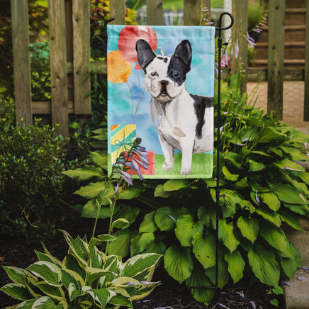 Decorate your space with our Birthday French Bulldog artwork on a Garden Flag. Enhance the beauty of your garden, patio, or yard with Caroline's Treasures Decorative Garden Flag, proudly made in the USA. Crafted from two pieces of thick, double-sided polyester fabric, this 2-ply garden flag is designed to withstand various weather conditions, making it water-resistant and weatherproof. Featuring correctly readable words on both sides, this garden flag offers a delightful visual experience from any angle. With its heavier weight, it stands out among other garden flags, ensuring stability and durability even in wind, rain, and snow. Measuring approximately 11 1/4 inches by 15 1/2 inches, this flag allows you to personalize your outdoor decor. It comes with a 1 1/2-inch sleeve sewn in, allowing easy attachment to any standard garden flag stand or garden size porch hanger (sold separately). Make a statement in your outdoor space with Caroline's Treasures Decorative Garden Flag, a vibrant and high-quality flag that adds color and personality to your surroundings. Proudly made in the USA, it's a symbol of quality craftsmanship and attention to detail.