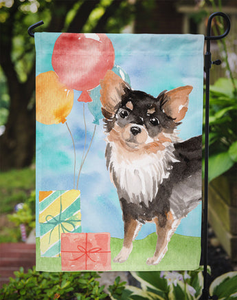 Decorate your space with our Birthday Chihuahua artwork on a Garden Flag. Enhance the beauty of your garden, patio, or yard with Caroline's Treasures Decorative Garden Flag, proudly made in the USA. Crafted from two pieces of thick, double-sided polyester fabric, this 2-ply garden flag is designed to withstand various weather conditions, making it water-resistant and weatherproof. Featuring correctly readable words on both sides, this garden flag offers a delightful visual experience from any angle. With its heavier weight, it stands out among other garden flags, ensuring stability and durability even in wind, rain, and snow. Measuring approximately 11 1/4 inches by 15 1/2 inches, this flag allows you to personalize your outdoor decor. It comes with a 1 1/2-inch sleeve sewn in, allowing easy attachment to any standard garden flag stand or garden size porch hanger (sold separately). Make a statement in your outdoor space with Caroline's Treasures Decorative Garden Flag, a vibrant and high-quality flag that adds color and personality to your surroundings. Proudly made in the USA, it's a symbol of quality craftsmanship and attention to detail.