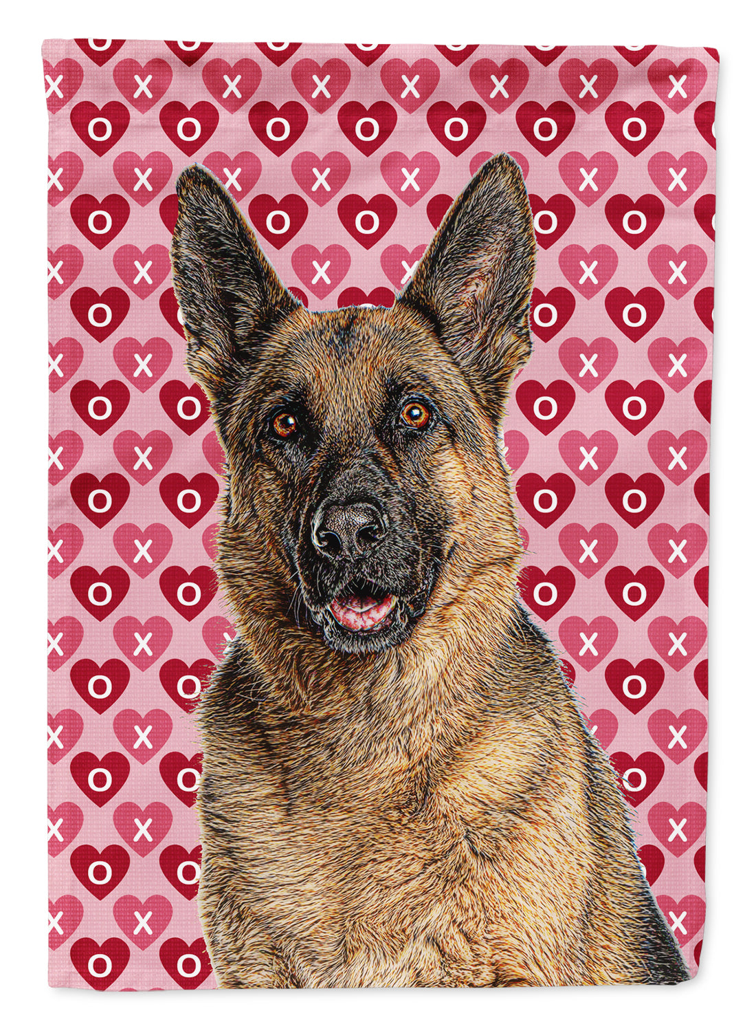 Decorate your space with our Valentine's Day German Shepherd artwork on a Garden Flag. Enhance the beauty of your garden, patio, or yard with Caroline's Treasures Decorative Garden Flag, proudly made in the USA. Crafted from two pieces of thick, double-sided polyester fabric, this 2-ply garden flag is designed to withstand various weather conditions, making it water-resistant and weatherproof. Featuring correctly readable words on both sides, this garden flag offers a delightful visual experience from any angle. With its heavier weight, it stands out among other garden flags, ensuring stability and durability even in wind, rain, and snow. Measuring approximately 11 1/4 inches by 15 1/2 inches, this flag allows you to personalize your outdoor decor. It comes with a 1 1/2-inch sleeve sewn in, allowing easy attachment to any standard garden flag stand or garden size porch hanger (sold separately). Make a statement in your outdoor space with Caroline's Treasures Decorative Garden Flag, a vibrant and high-quality flag that adds color and personality to your surroundings. Proudly made in the USA, it's a symbol of quality craftsmanship and attention to detail.