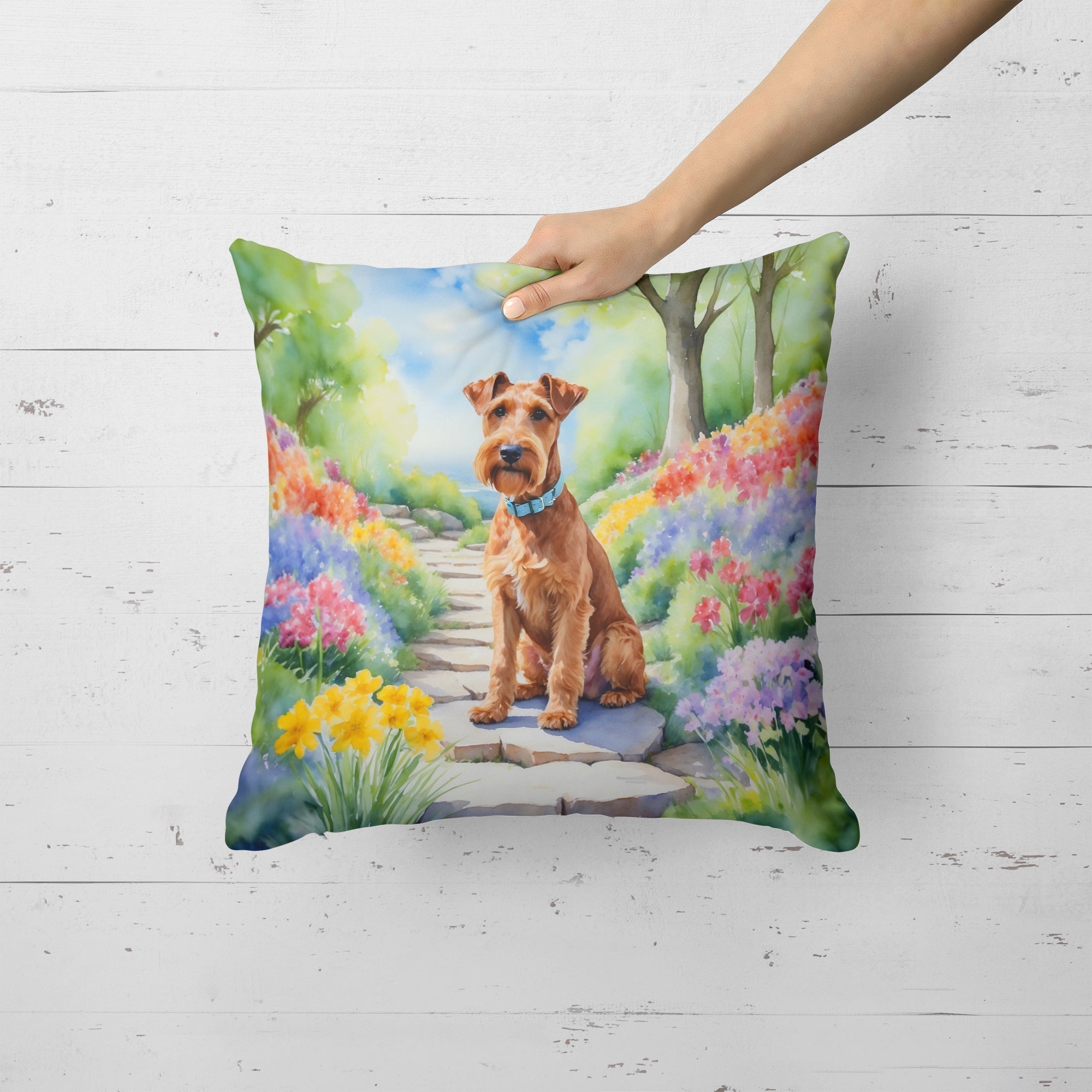Decorate your space with Caroline's Treasures Irish Terrier artwork on a Pillow. Bring a bit of Spring into your home with a Spring Pillow. Revitalize your outdoor or indoor living space with Caroline's Treasures 18x18 Fabric Decorative Pillow. With a generously sized dimension of approximately 18 inches by 18 inches, this pillow makes a comfortable and aesthetic addition to any seating area. Made from a unique, water-resistant material developed by Caroline's Treasures, the pillow sham is 100% polyester fabric that's durable and ready to weather any condition. Its vibrant, full-color artwork will not fade over time as it is dyed with color-fast dyes. Whether you place it on your patio furniture, porch, veranda, or indoor couch, its soft canvas fabric ensures a cozy experience. The pillow is handcrafted in the United States, featuring a sham created from three pieces of fabric and a polyester insert for enduring shape and overstuffed comfort. Despite being robustly built to endure the outdoors, it is as soft and snug as your favorite indoor cushions. Please note, as all Caroline's Treasures pillows are handmade, sizes may vary slightly, adding to the charm of this unique decorative item.