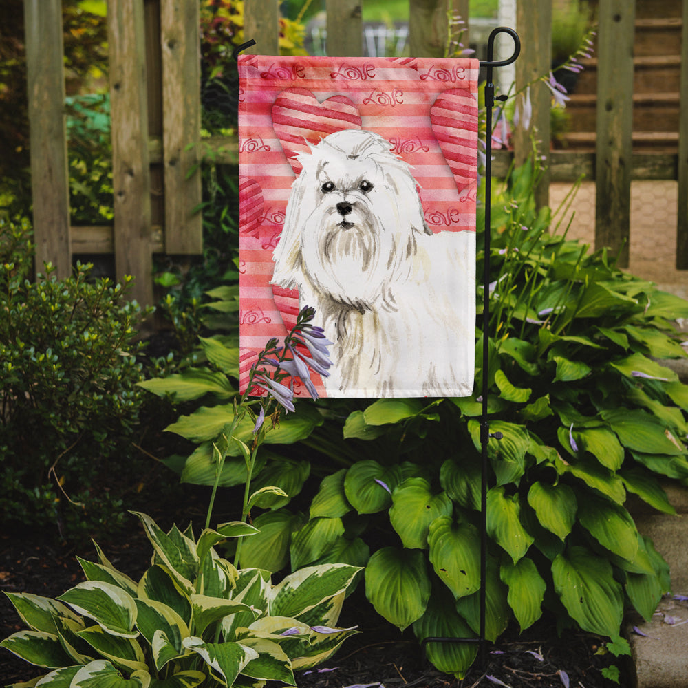 Decorate your space with our Valentine's Day Maltese artwork on a Garden Flag. Enhance the beauty of your garden, patio, or yard with Caroline's Treasures Decorative Garden Flag, proudly made in the USA. Crafted from two pieces of thick, double-sided polyester fabric, this 2-ply garden flag is designed to withstand various weather conditions, making it water-resistant and weatherproof. Featuring correctly readable words on both sides, this garden flag offers a delightful visual experience from any angle. With its heavier weight, it stands out among other garden flags, ensuring stability and durability even in wind, rain, and snow. Measuring approximately 11 1/4 inches by 15 1/2 inches, this flag allows you to personalize your outdoor decor. It comes with a 1 1/2-inch sleeve sewn in, allowing easy attachment to any standard garden flag stand or garden size porch hanger (sold separately). Make a statement in your outdoor space with Caroline's Treasures Decorative Garden Flag, a vibrant and high-quality flag that adds color and personality to your surroundings. Proudly made in the USA, it's a symbol of quality craftsmanship and attention to detail.