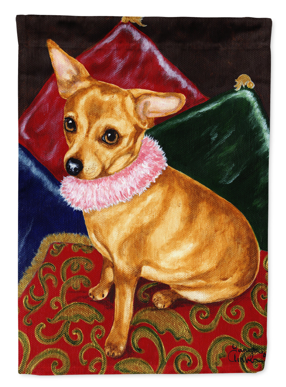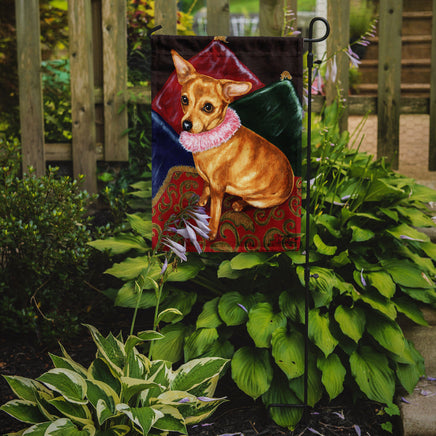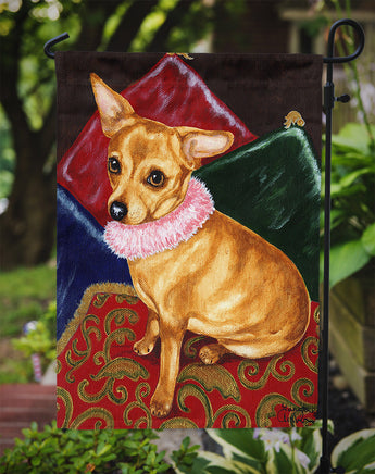 Decorate your space with our Chihuahua artwork on a Garden Flag. Enhance the beauty of your garden, patio, or yard with Caroline's Treasures Decorative Garden Flag, proudly made in the USA. Crafted from two pieces of thick, double-sided polyester fabric, this 2-ply garden flag is designed to withstand various weather conditions, making it water-resistant and weatherproof. Featuring correctly readable words on both sides, this garden flag offers a delightful visual experience from any angle. With its heavier weight, it stands out among other garden flags, ensuring stability and durability even in wind, rain, and snow. Measuring approximately 11 1/4 inches by 15 1/2 inches, this flag allows you to personalize your outdoor decor. It comes with a 1 1/2-inch sleeve sewn in, allowing easy attachment to any standard garden flag stand or garden size porch hanger (sold separately). Make a statement in your outdoor space with Caroline's Treasures Decorative Garden Flag, a vibrant and high-quality flag that adds color and personality to your surroundings. Proudly made in the USA, it's a symbol of quality craftsmanship and attention to detail.