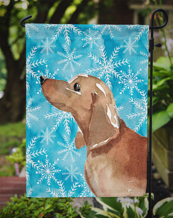 Decorate your space with our Dachshund artwork on a Garden Flag. Bring a bit of Winter into your home with a Winter Garden Flag. Enhance the beauty of your garden, patio, or yard with Caroline's Treasures Decorative Garden Flag, proudly made in the USA. Crafted from two pieces of thick, double-sided polyester fabric, this 2-ply garden flag is designed to withstand various weather conditions, making it water-resistant and weatherproof. Featuring correctly readable words on both sides, this garden flag offers a delightful visual experience from any angle. With its heavier weight, it stands out among other garden flags, ensuring stability and durability even in wind, rain, and snow. Measuring approximately 11 1/4 inches by 15 1/2 inches, this flag allows you to personalize your outdoor decor. It comes with a 1 1/2-inch sleeve sewn in, allowing easy attachment to any standard garden flag stand or garden size porch hanger (sold separately). Make a statement in your outdoor space with Caroline's Treasures Decorative Garden Flag, a vibrant and high-quality flag that adds color and personality to your surroundings. Proudly made in the USA, it's a symbol of quality craftsmanship and attention to detail.