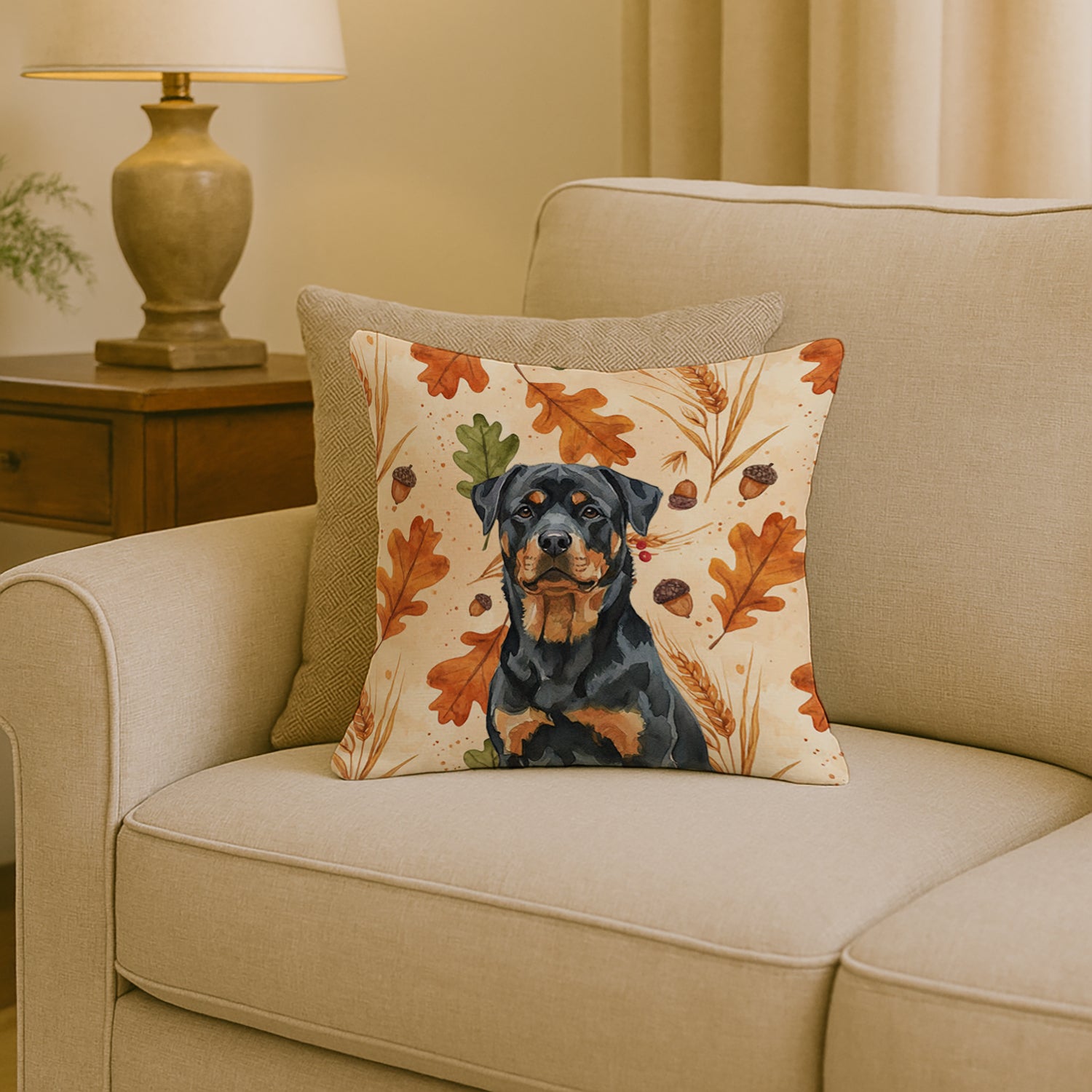 Throw Pillow featuring breed specific Rottweiler artwork. Celebrate Thanksgiving with this Thanksgiving Pillow. Revitalize your outdoor or indoor living space with Caroline's Treasures 18" x 18" Fabric Decorative Pillow. With a generously sized dimension of approximately 18 inches by 18 inches, this pillow makes a comfortable and aesthetic addition to any seating area. Made from a unique, water-resistant material developed by Caroline's Treasures, the pillow sham is 100% polyester fabric that's durable and ready to weather any condition. Its vibrant, full-color artwork will not fade over time as it is dyed with color-fast dyes. Whether you place it on your patio furniture, porch, veranda, or indoor couch, its soft canvas fabric ensures a cozy experience. The pillow is handcrafted in the United States, featuring a sham created from three pieces of fabric and a polyester insert for enduring shape and overstuffed comfort. Despite being robustly built to endure the outdoors, it is as soft and snug as your favorite indoor cushions. Please note, as all this Caroline's Treasures pillows are handmade, sizes may vary slightly, adding to the charm of this unique decorative item.
