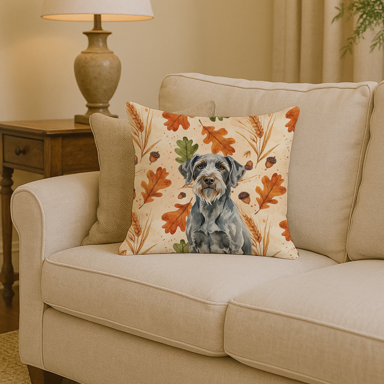 Throw Pillow featuring breed specific Wirehaired Pointing Griffon artwork. Celebrate Thanksgiving with this Thanksgiving Pillow. Add a touch of vibrancy and comfort to your outdoor seating with Caroline's Treasures Fabric Decorative Pillow. Approximately 14 inches by 14 inches, this outdoor pillow is crafted to elevate the appeal of your patio furniture, infusing it with vivid color and artistic flair. The pillow includes a 100% Polyester Fabric sham filled with a quality pillow form to provide superior comfort. Innovatively made from this Caroline's Treasures brand new material, specifically woven for its water resistance, this pillow is designed for durability. The soft canvas fabric offers versatility in use, fit for your indoor couch or your outdoor patio, porch, or veranda. The fabric is dyed with colorfast dyes built for resilience against weather conditions, ensuring the pillow retains its beauty over time. Constructed by sewing three fabric pieces to create a sham, the polyester insert is then nestled inside to form the pillow, resulting in an overstuffed pillow that maintains its shape. Both the sham and the pillow insert are proudly made in the United States. As the pillows are handcrafted, there may be minor variations in size, further enhancing their unique charm. Experience comfort in style with Caroline's Treasures Fabric Decorative Pillow.