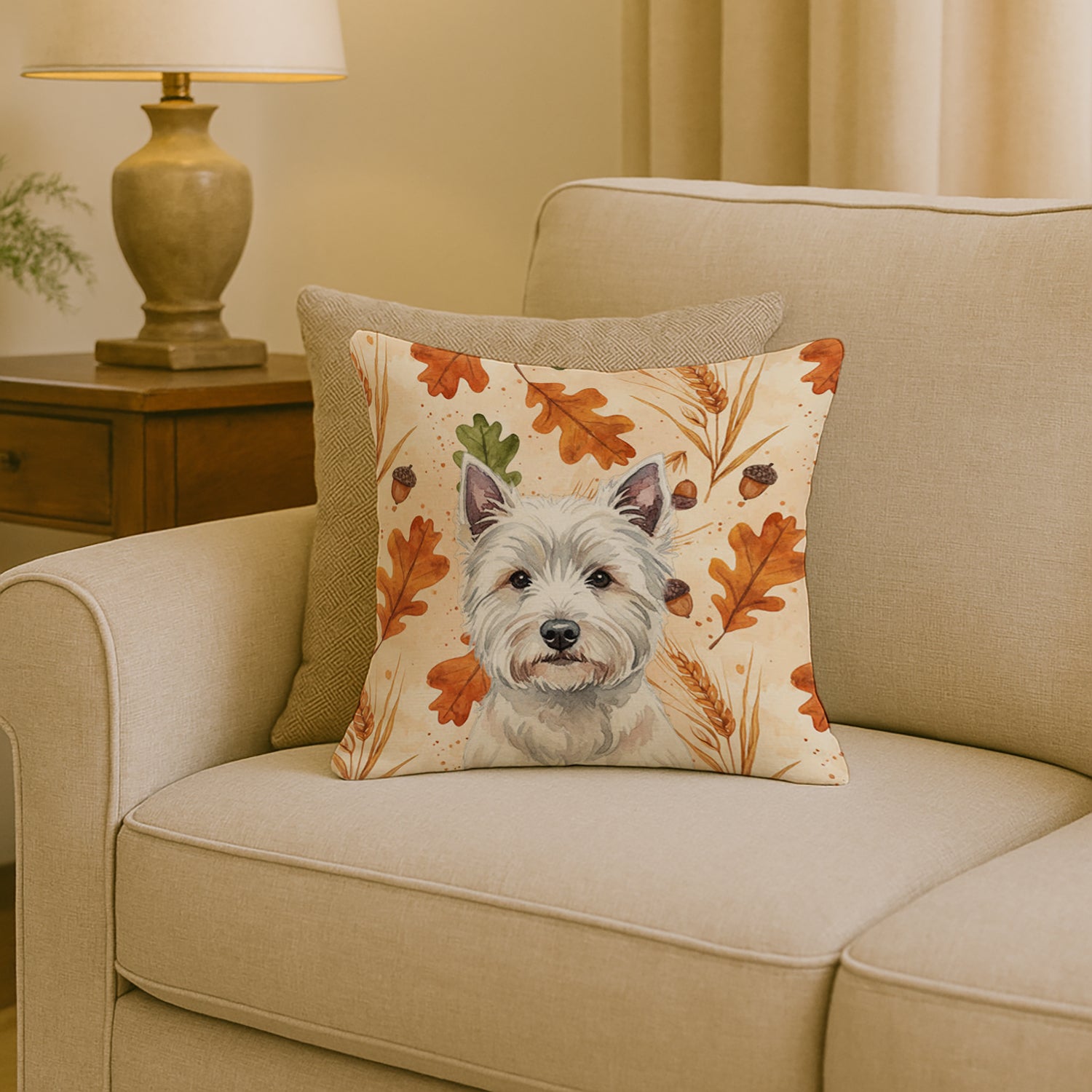 Throw Pillow featuring breed specific West Highland White Terrier artwork. Celebrate Thanksgiving with this Thanksgiving Pillow. Revitalize your outdoor or indoor living space with Caroline's Treasures 18" x 18" Fabric Decorative Pillow. With a generously sized dimension of approximately 18 inches by 18 inches, this pillow makes a comfortable and aesthetic addition to any seating area. Made from a unique, water-resistant material developed by Caroline's Treasures, the pillow sham is 100% polyester fabric that's durable and ready to weather any condition. Its vibrant, full-color artwork will not fade over time as it is dyed with color-fast dyes. Whether you place it on your patio furniture, porch, veranda, or indoor couch, its soft canvas fabric ensures a cozy experience. The pillow is handcrafted in the United States, featuring a sham created from three pieces of fabric and a polyester insert for enduring shape and overstuffed comfort. Despite being robustly built to endure the outdoors, it is as soft and snug as your favorite indoor cushions. Please note, as all this Caroline's Treasures pillows are handmade, sizes may vary slightly, adding to the charm of this unique decorative item.