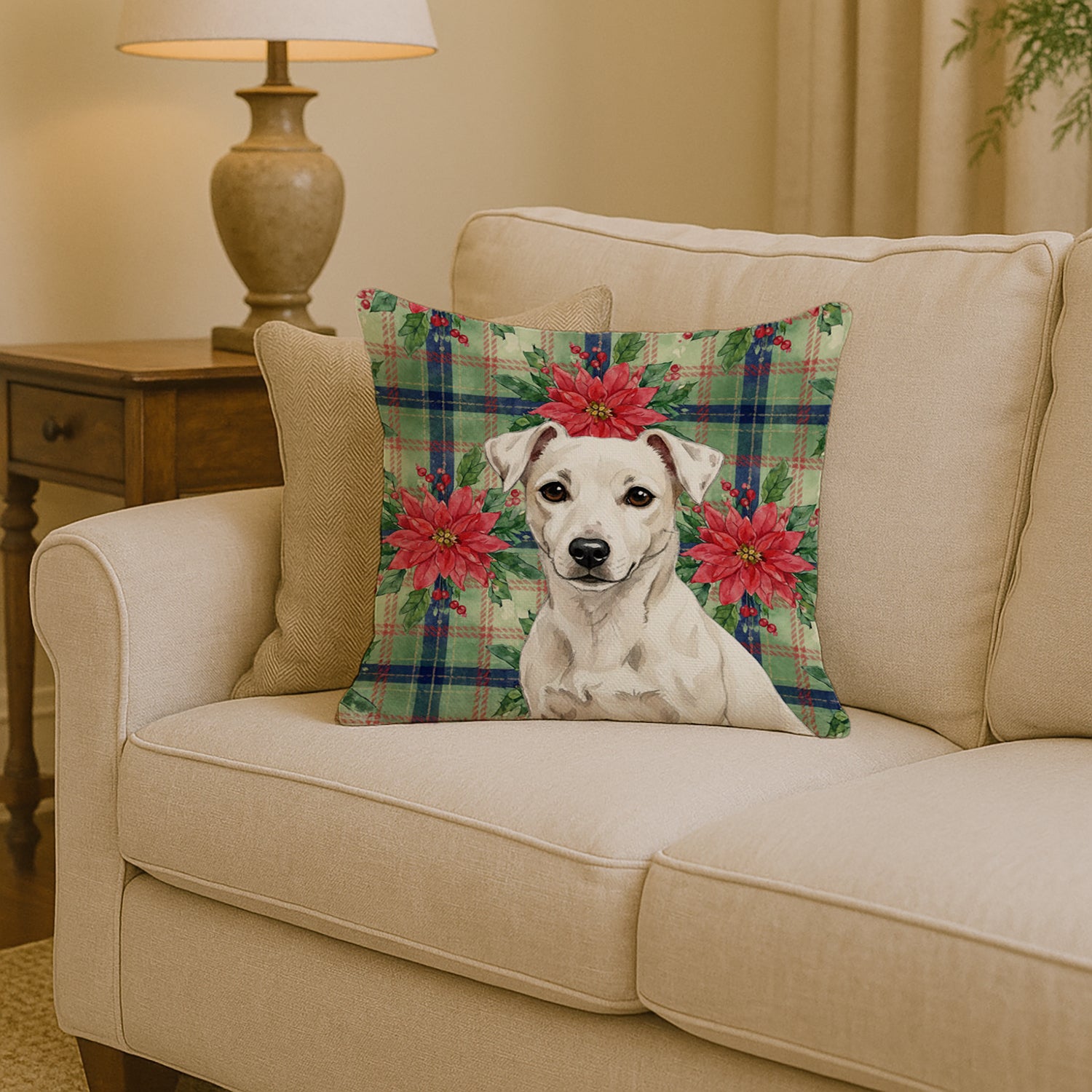 Throw Pillow featuring breed specific Jack Russell Terrier artwork. Celebrate Christmas with this Christmas Pillow. Add a touch of vibrancy and comfort to your outdoor seating with Caroline's Treasures Fabric Decorative Pillow. Approximately 14 inches by 14 inches, this outdoor pillow is crafted to elevate the appeal of your patio furniture, infusing it with vivid color and artistic flair. The pillow includes a 100% Polyester Fabric sham filled with a quality pillow form to provide superior comfort. Innovatively made from this Caroline's Treasures brand new material, specifically woven for its water resistance, this pillow is designed for durability. The soft canvas fabric offers versatility in use, fit for your indoor couch or your outdoor patio, porch, or veranda. The fabric is dyed with colorfast dyes built for resilience against weather conditions, ensuring the pillow retains its beauty over time. Constructed by sewing three fabric pieces to create a sham, the polyester insert is then nestled inside to form the pillow, resulting in an overstuffed pillow that maintains its shape. Both the sham and the pillow insert are proudly made in the United States. As the pillows are handcrafted, there may be minor variations in size, further enhancing their unique charm. Experience comfort in style with Caroline's Treasures Fabric Decorative Pillow.