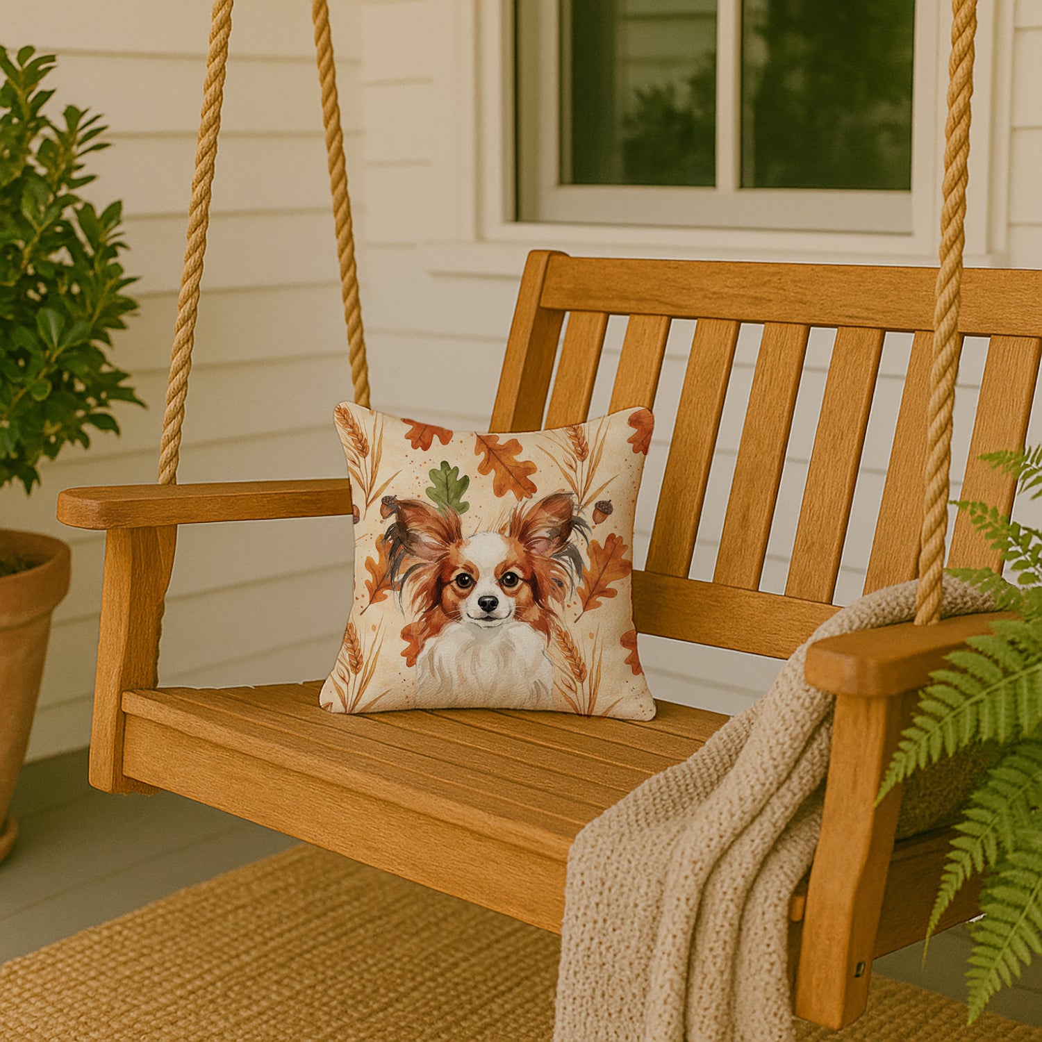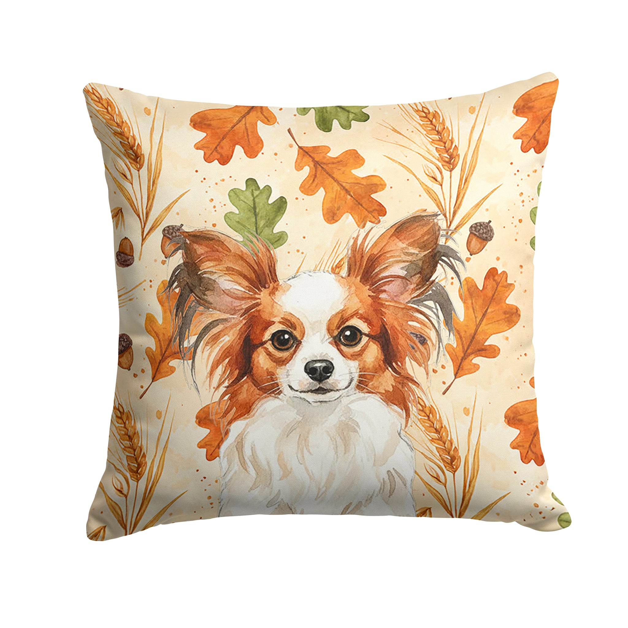 Throw Pillow featuring breed specific Papillon artwork. Celebrate Thanksgiving with this Thanksgiving Pillow. Add a touch of vibrancy and comfort to your outdoor seating with Caroline's Treasures Fabric Decorative Pillow. Approximately 14 inches by 14 inches, this outdoor pillow is crafted to elevate the appeal of your patio furniture, infusing it with vivid color and artistic flair. The pillow includes a 100% Polyester Fabric sham filled with a quality pillow form to provide superior comfort. Innovatively made from this Caroline's Treasures brand new material, specifically woven for its water resistance, this pillow is designed for durability. The soft canvas fabric offers versatility in use, fit for your indoor couch or your outdoor patio, porch, or veranda. The fabric is dyed with colorfast dyes built for resilience against weather conditions, ensuring the pillow retains its beauty over time. Constructed by sewing three fabric pieces to create a sham, the polyester insert is then nestled inside to form the pillow, resulting in an overstuffed pillow that maintains its shape. Both the sham and the pillow insert are proudly made in the United States. As the pillows are handcrafted, there may be minor variations in size, further enhancing their unique charm. Experience comfort in style with Caroline's Treasures Fabric Decorative Pillow.