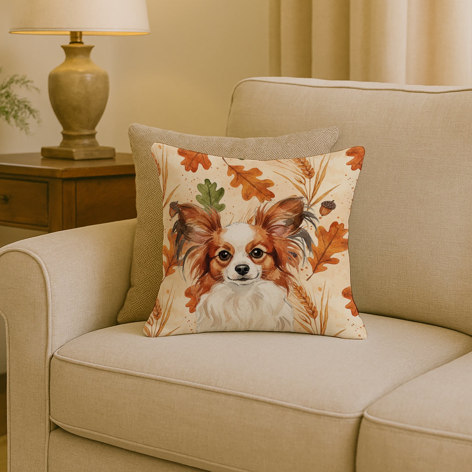 Throw Pillow featuring breed specific Papillon artwork. Celebrate Thanksgiving with this Thanksgiving Pillow. Revitalize your outdoor or indoor living space with Caroline's Treasures 18" x 18" Fabric Decorative Pillow. With a generously sized dimension of approximately 18 inches by 18 inches, this pillow makes a comfortable and aesthetic addition to any seating area. Made from a unique, water-resistant material developed by Caroline's Treasures, the pillow sham is 100% polyester fabric that's durable and ready to weather any condition. Its vibrant, full-color artwork will not fade over time as it is dyed with color-fast dyes. Whether you place it on your patio furniture, porch, veranda, or indoor couch, its soft canvas fabric ensures a cozy experience. The pillow is handcrafted in the United States, featuring a sham created from three pieces of fabric and a polyester insert for enduring shape and overstuffed comfort. Despite being robustly built to endure the outdoors, it is as soft and snug as your favorite indoor cushions. Please note, as all this Caroline's Treasures pillows are handmade, sizes may vary slightly, adding to the charm of this unique decorative item.